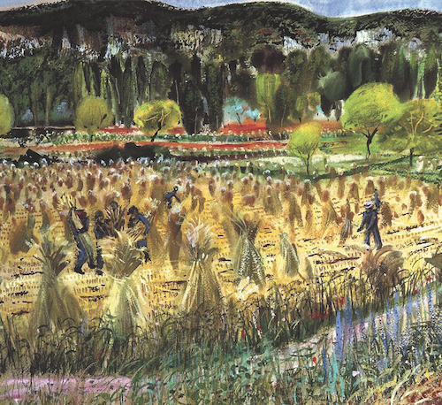 A lyrical harvest study from the Lot Valley, France: rows of corn stacks and small figures set beneath a deep green tree line. Rendered in gouache and pastel for grainy texture and a warm, late-summer palette. Ideal across countryside, travel and fine-art ranges.