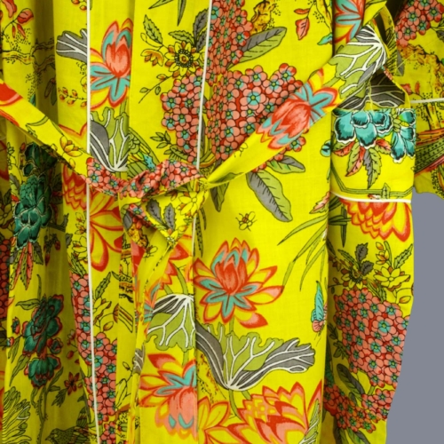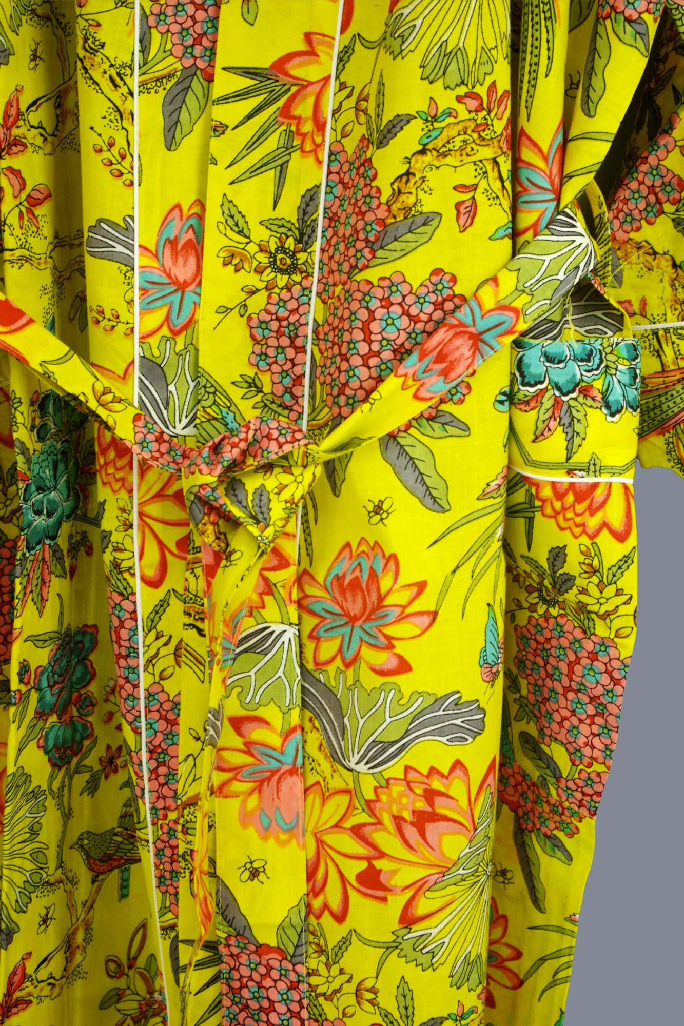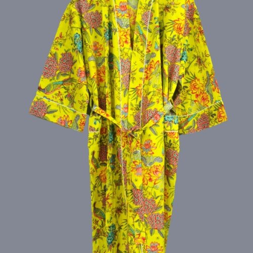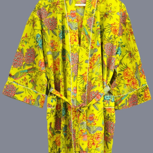 Cotton Kimono Dressing Gown Robe- Bird Print Mustard Base