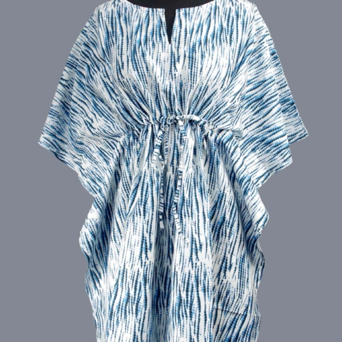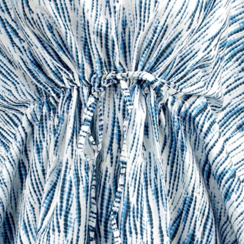 Our short stunning block printed kaftan has drawstring detail to adjust the fit, and side slits for an easy-breezy look.