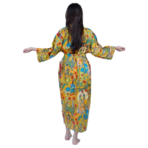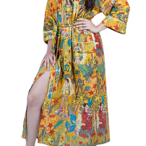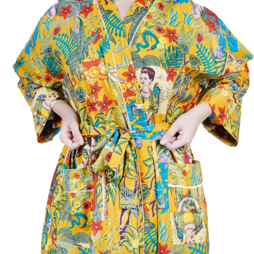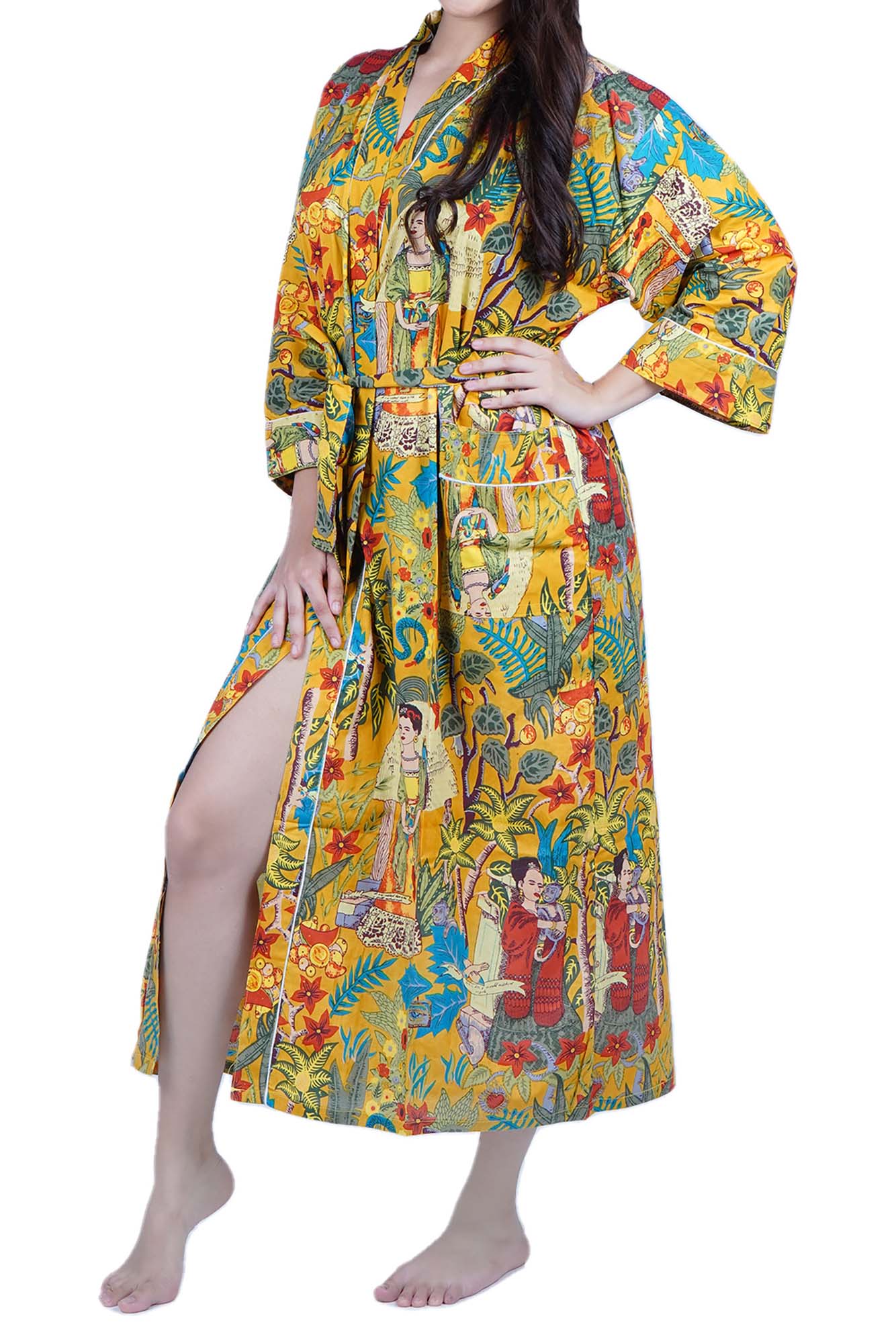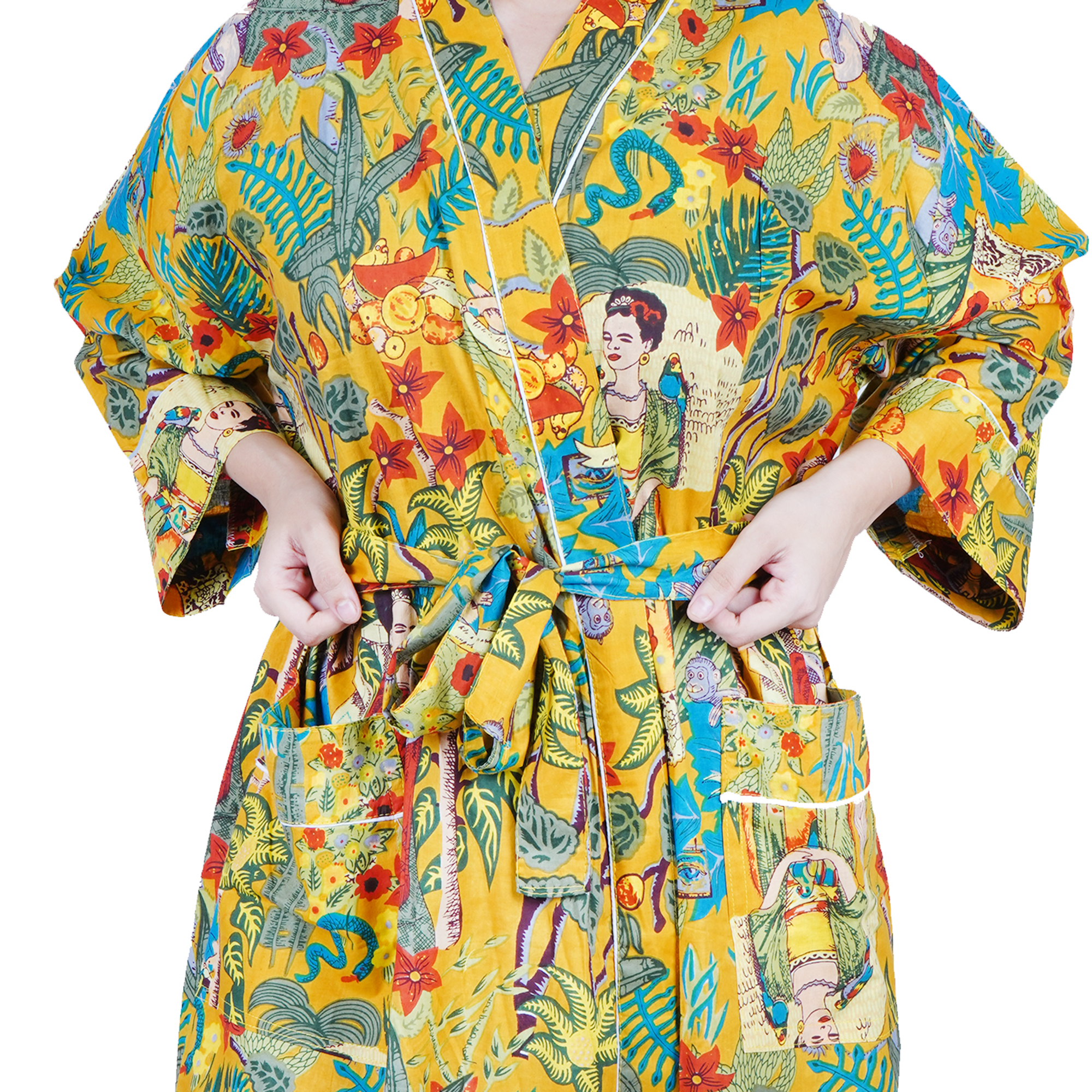 Cotton Kimono Dressing Gown Robe – Mustard Yellow Frida Kahlo