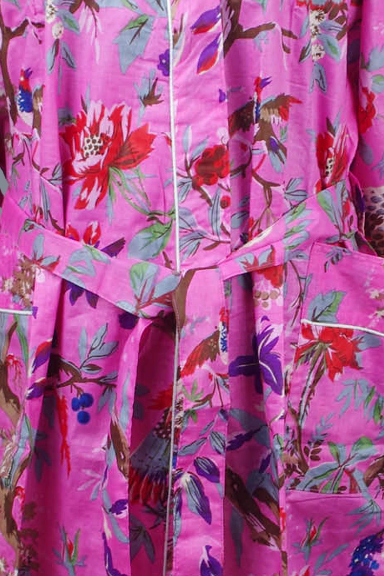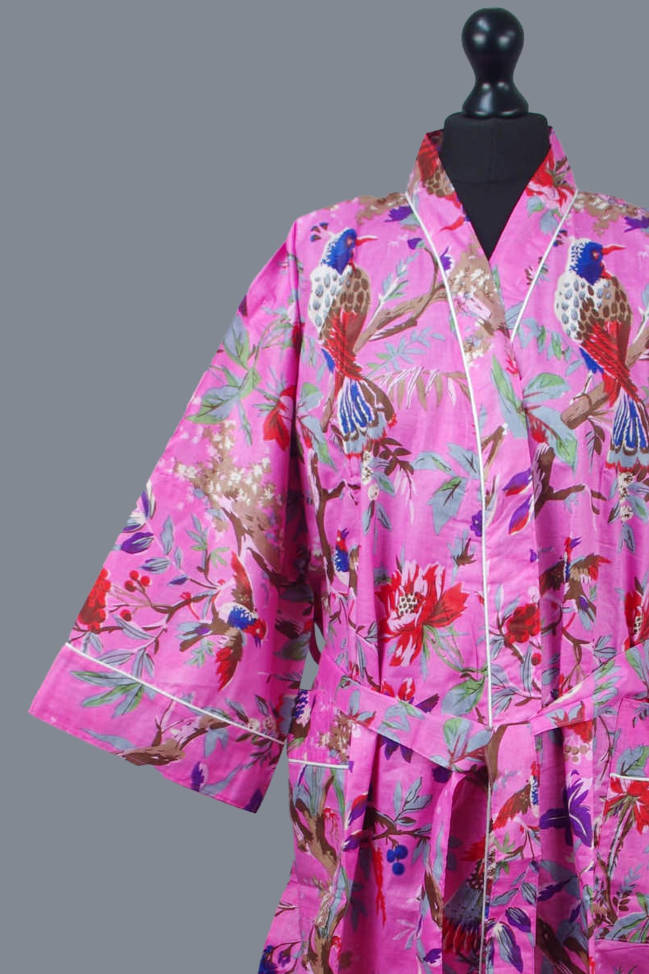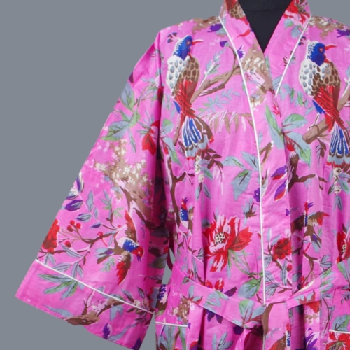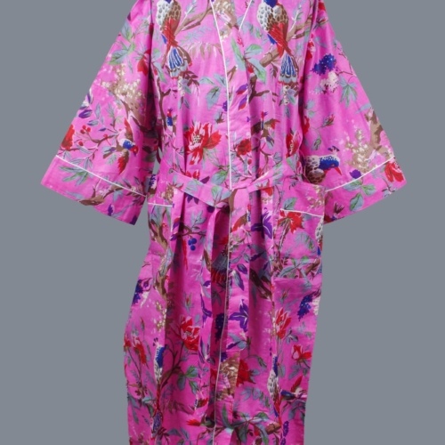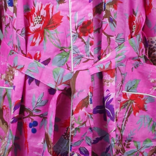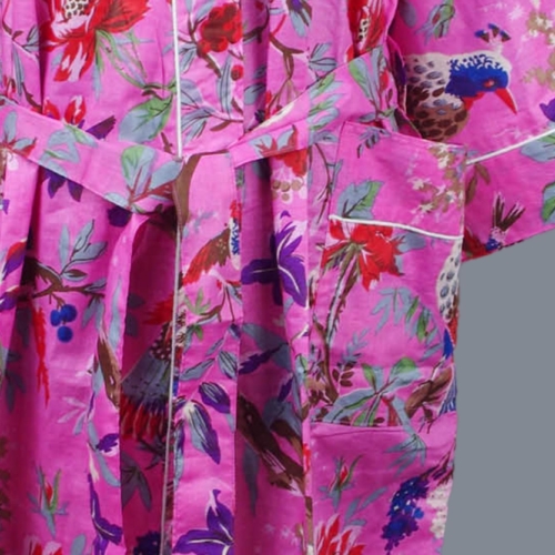 Cotton Kimono Dressing Gown Robe – Pink Tropical Birds Print
