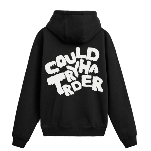 This is one heavyweight hoodie for the average under achiever – 400gsm – if you know your cotton, this is STRONG work. For those that don’t – it’s banging hoodie you can wear to anything, and it still feels the bomb The details: Set-in sleeve, Double layered hood in soft cotton fabric Some pretty sweet PARIA neck tape, ribbed at sleeve hem and bottom hem. Kangaroo pocket at front. Unisex extra heavy dropped shoulder black pullover hoodie Less is sometimes more