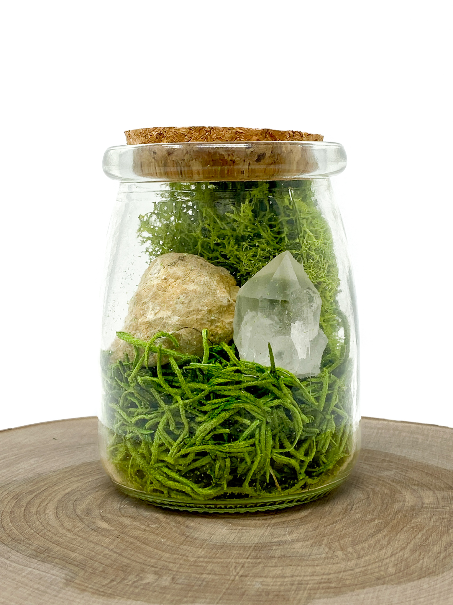 This terrarium comes with an unbroken Geode that you can remove, break open, discover the beauty inside, and place back into your terrarium.