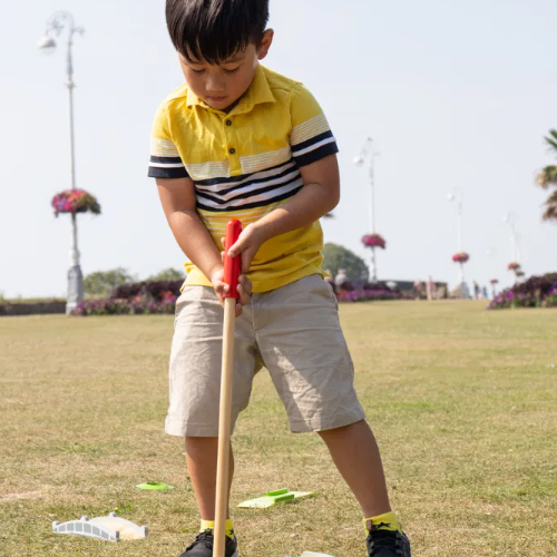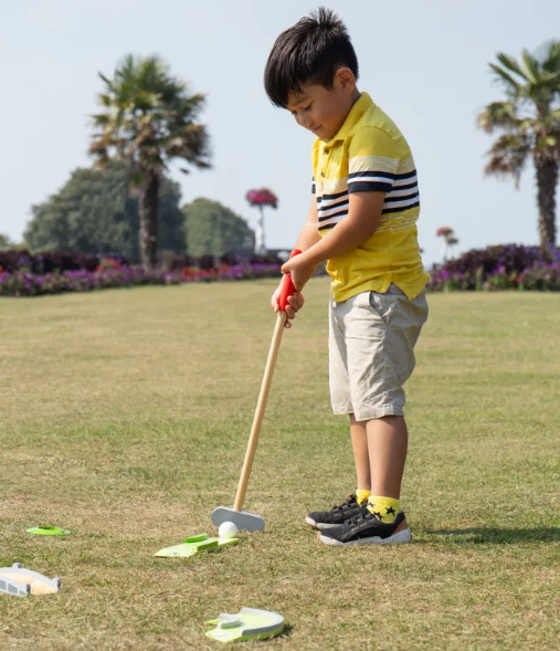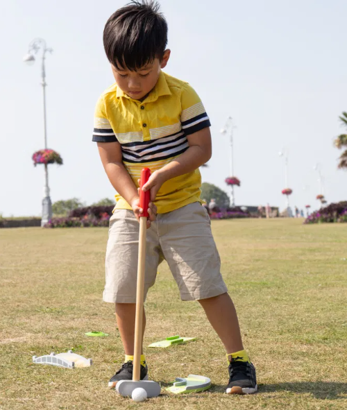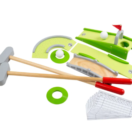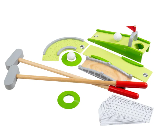 Designed for young children, this Crazy Golf Set features a variety of unique obstacles that are perfect for improving hand-eye coordination and dexterity. Each perfectly sized wooden club is ideal for little hands to grip, making it perfect for both independent and group play. The included score sheets allow for friendly competition between friends and family, while the high quality, responsibly sourced materials ensure safety and durability. Meeting current European safety standards, this set is suitable for ages 3 and up. Dimensions: 36cm (height) x 36cm (width) x 9cm (depth).
