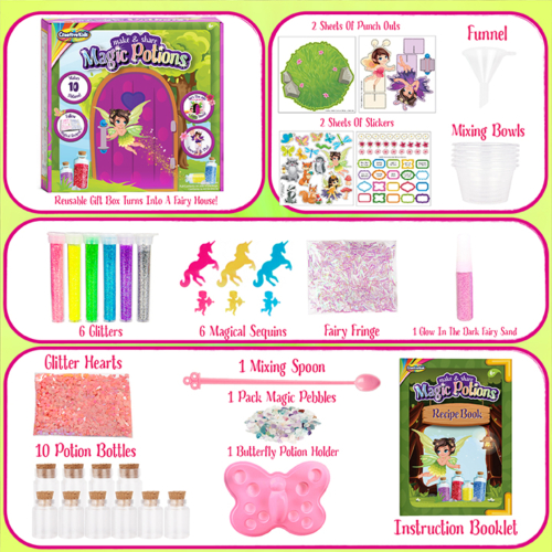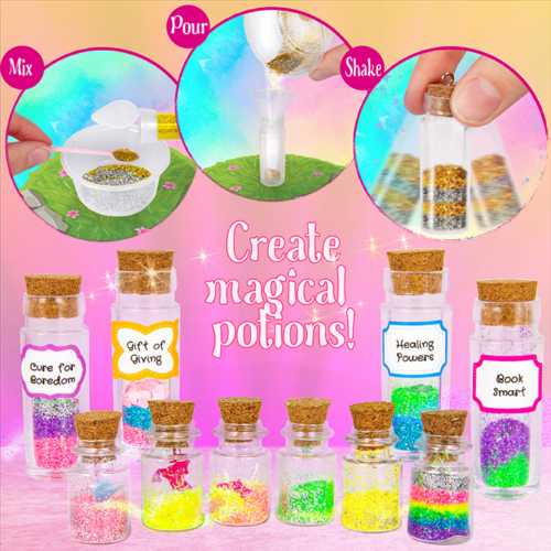 Immerse yourself in a mystical world full of fairies and potions where everything is ripe with magic. Make new fairy friends as you collect ingredients for your magic potions. Follow along the detailed recipe book to create 9 different potions for various uses. Each sparkly ingredient comes straight from the fairy gardens so you know they will definitely work! Each potion even comes with a spell to chant to activate the magic in the bottle. You can create potions for luck, happiness, sunshine, friendship & much more! You can even cook up your own potion recipe!