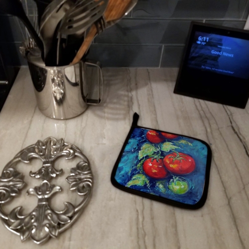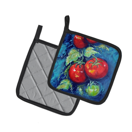 A Pair of Pot Holders to match your kitchen decor. Made in the USA these are thick and functional. Full color artwork decorates the front polyester fabric of the hot pad and accented by a black trim. Use these at as a trivet for your Thanksgiving or Christmas tablescape. Filled with insulated fabric and quilted for durability. These colorful pot holders will make a great gift for your favorite home cook or executive chef. Each pot holder measures approximately 7 1/2 inches by 7 1/2 inches. A hanging tab is included.