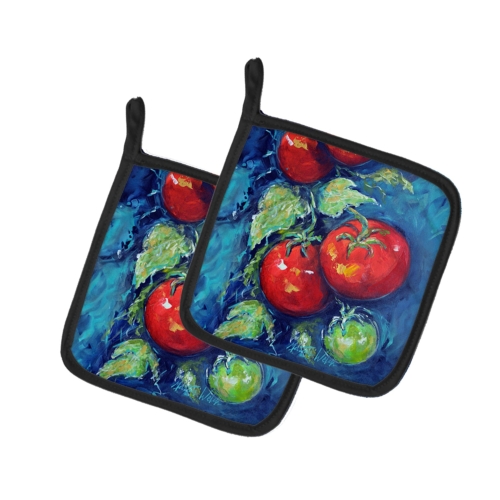 A Pair of Pot Holders to match your kitchen decor. Made in the USA these are thick and functional. Full color artwork decorates the front polyester fabric of the hot pad and accented by a black trim. Use these at as a trivet for your Thanksgiving or Christmas tablescape. Filled with insulated fabric and quilted for durability. These colorful pot holders will make a great gift for your favorite home cook or executive chef. Each pot holder measures approximately 7 1/2 inches by 7 1/2 inches. A hanging tab is included.