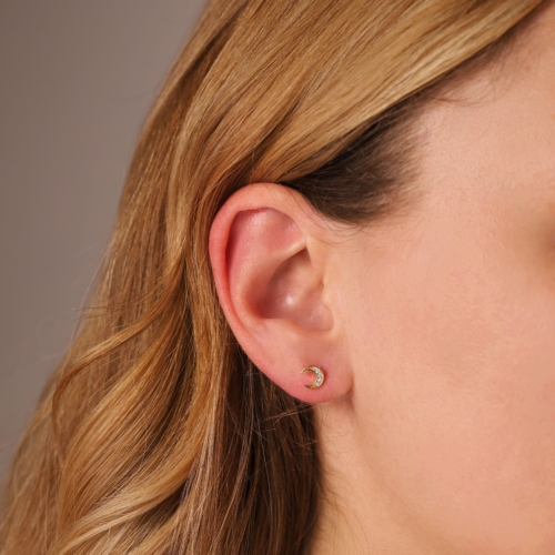 DESCRIPTIONAdd some celestial style to your ear stack with the Crescent Moon Stud Earrings. Crafted from hallmarked 925 sterling silver and plated in either rhodium or 18ct gold with sparkly pavé-set cubic zirconia detailing, these delicate stud earrings are secured with butterfly backs and perfect for everyday wear. Suitable for wear in a lobe piercing or helix piercing. SIZINGEach moon measures 6.4mm x 5.8mm and 1mm thick. PACKAGINGDelivered in a Gold Trip presentation box with foam insert, perfect for gifting yourself or others.