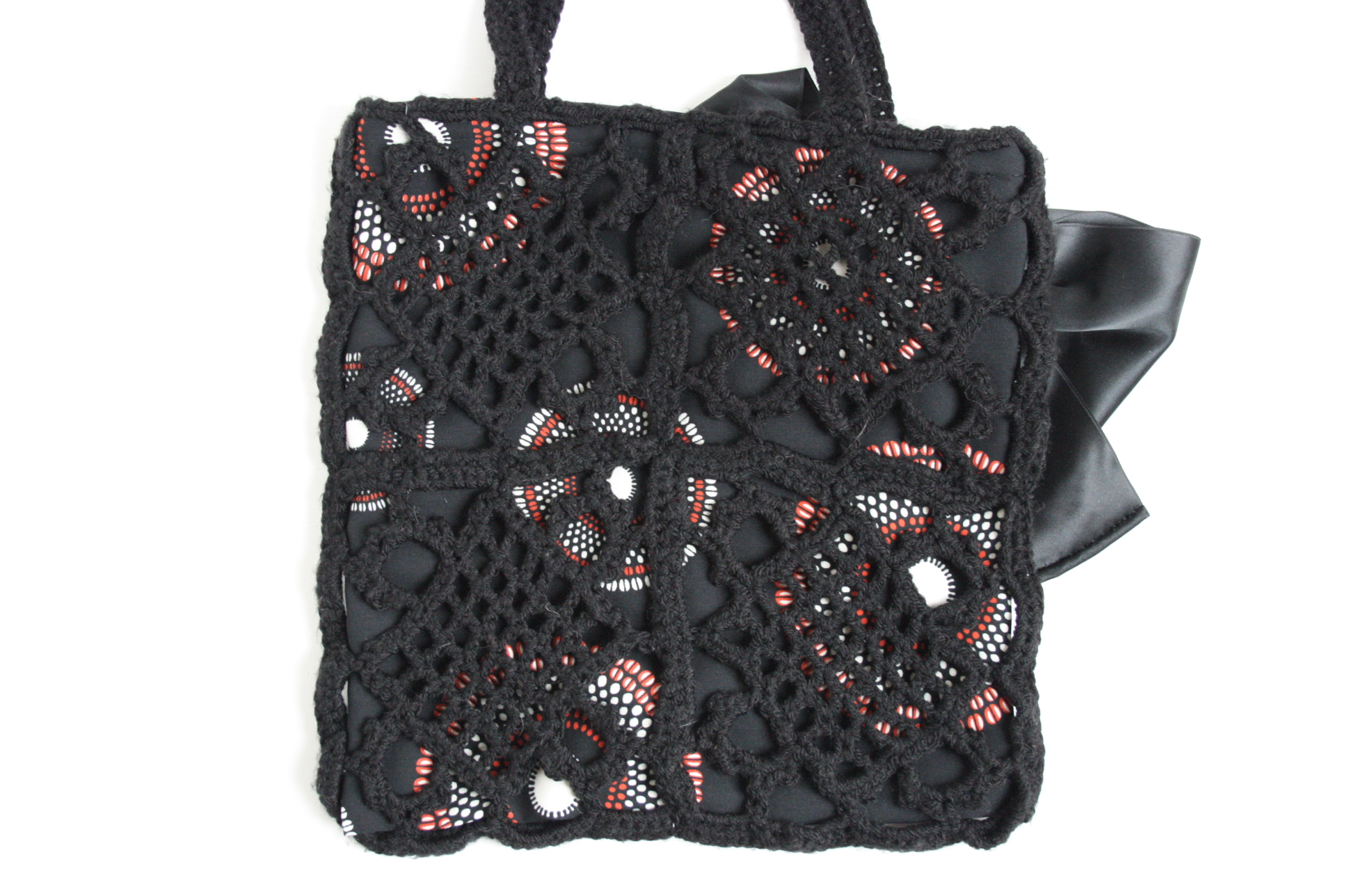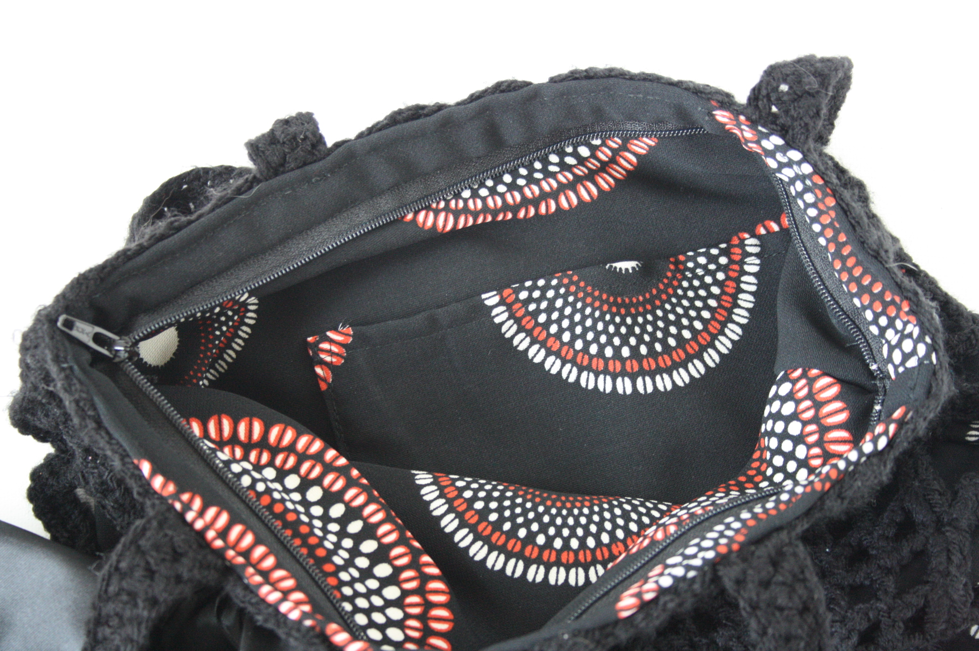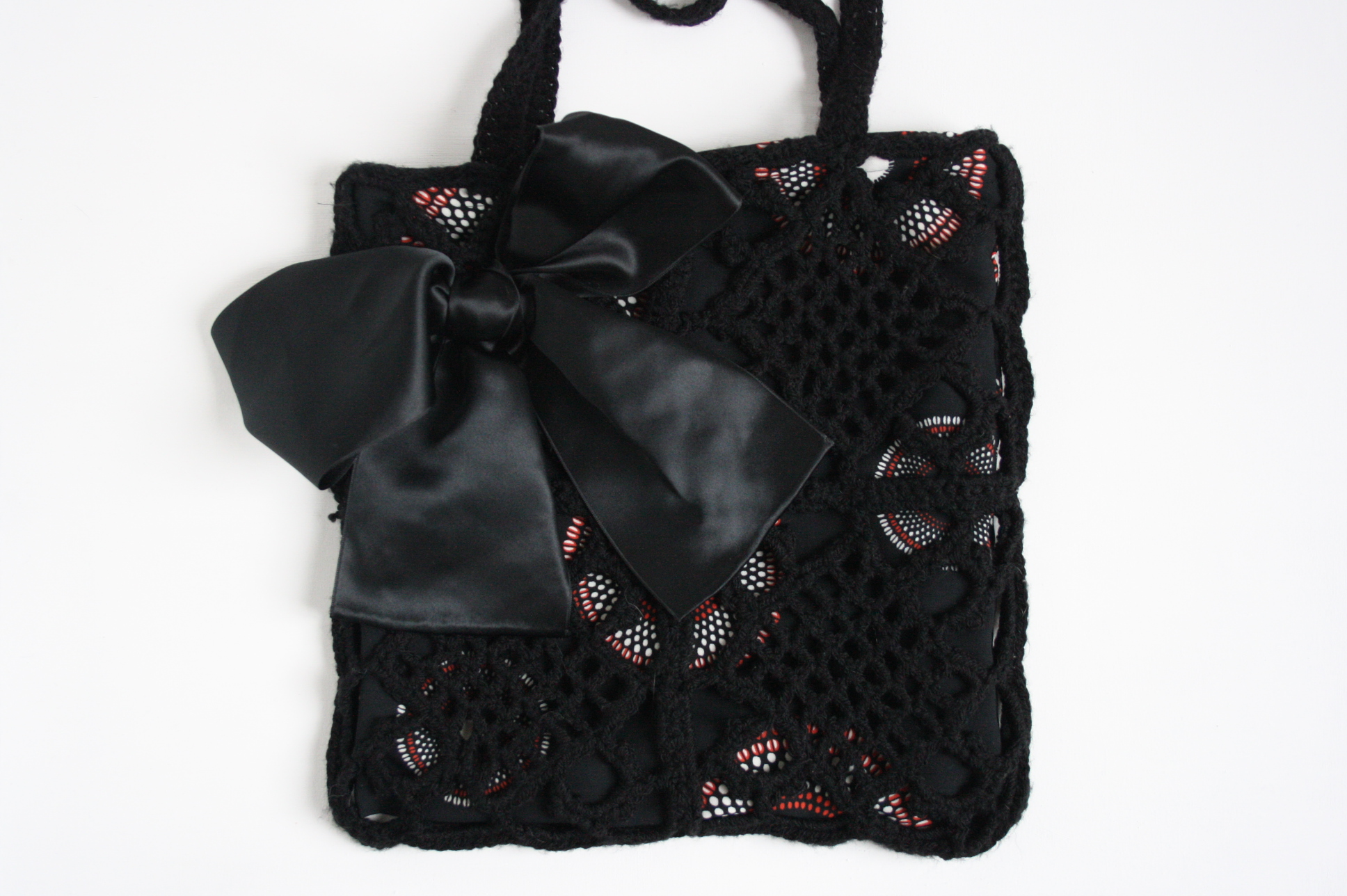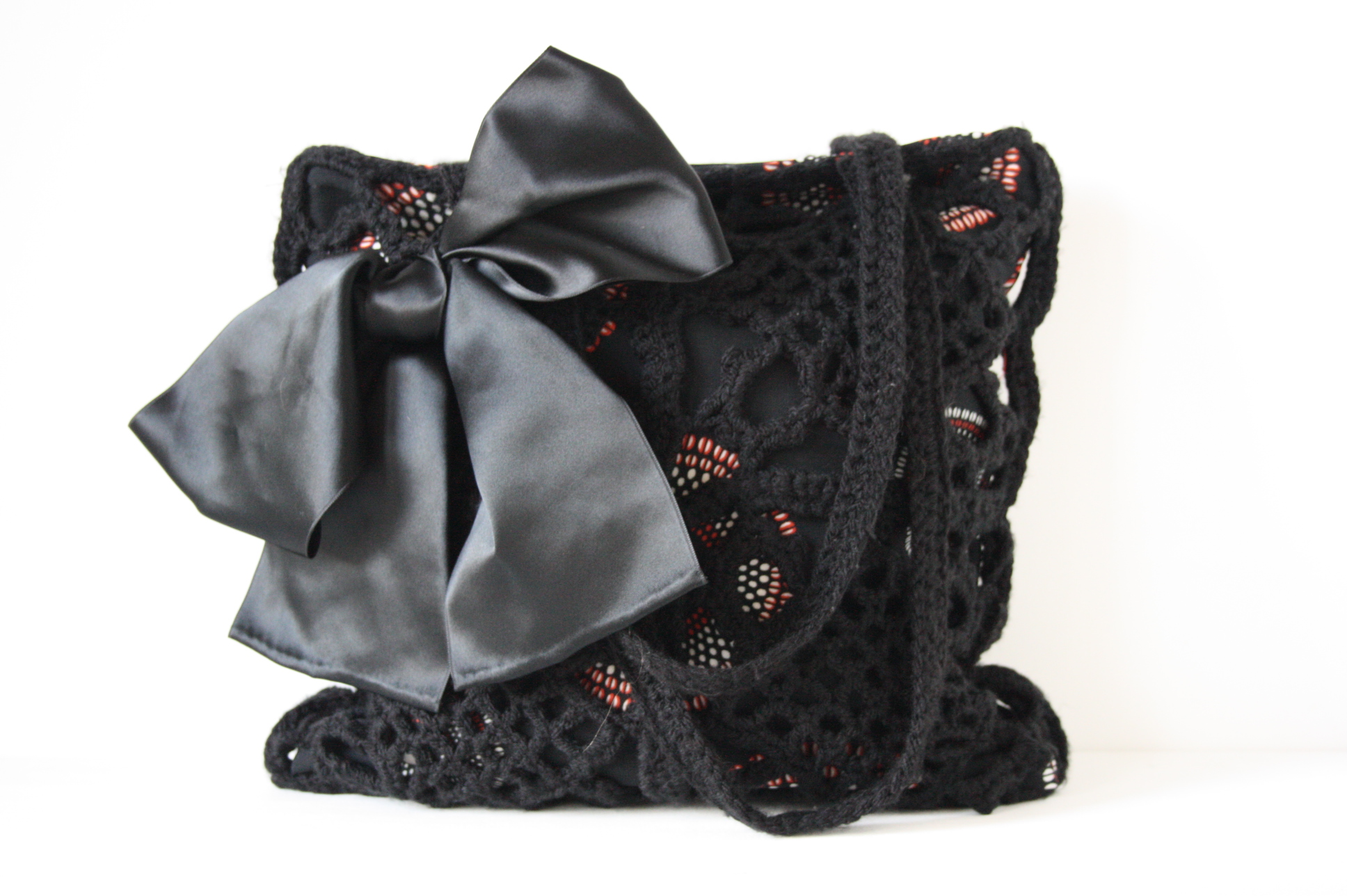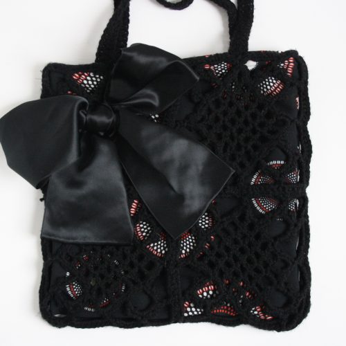 Black crocheted shoulder bag made of acrylic wool with a lining of black fabric with a retro pattern. The bag closes with a zipper and on the inside is a pocket for small items. Size is approximately 30 x 30 cm. Handle is approximately 65 cm long. All bags are unique, there’s only one of them.