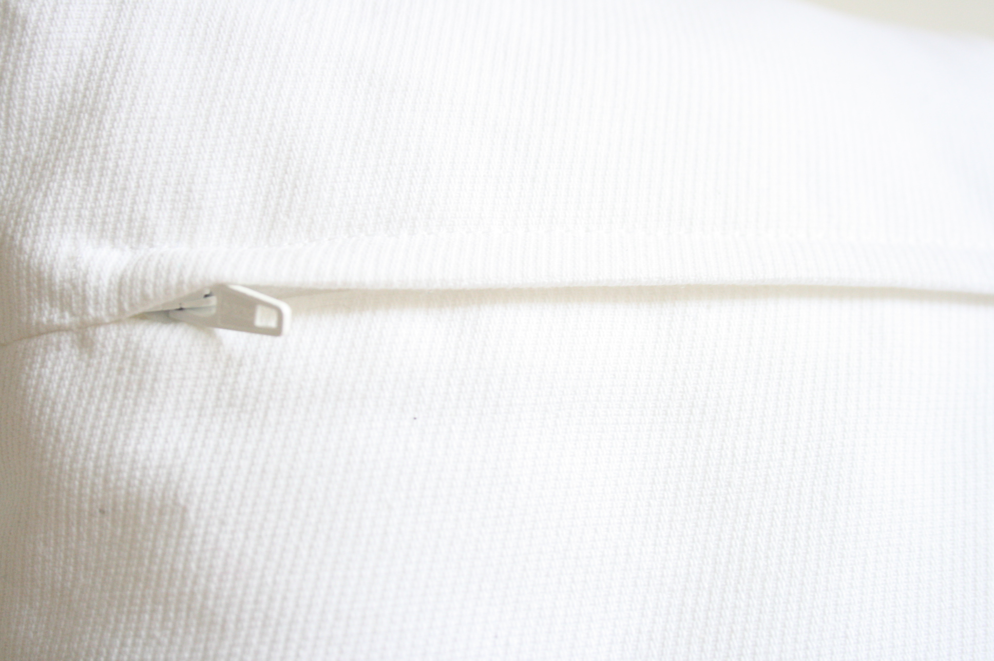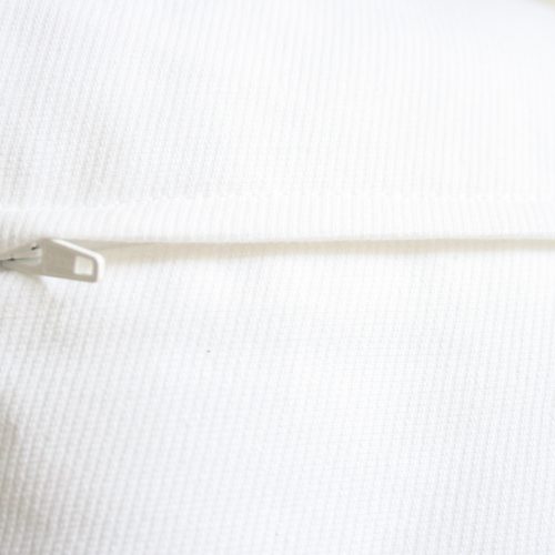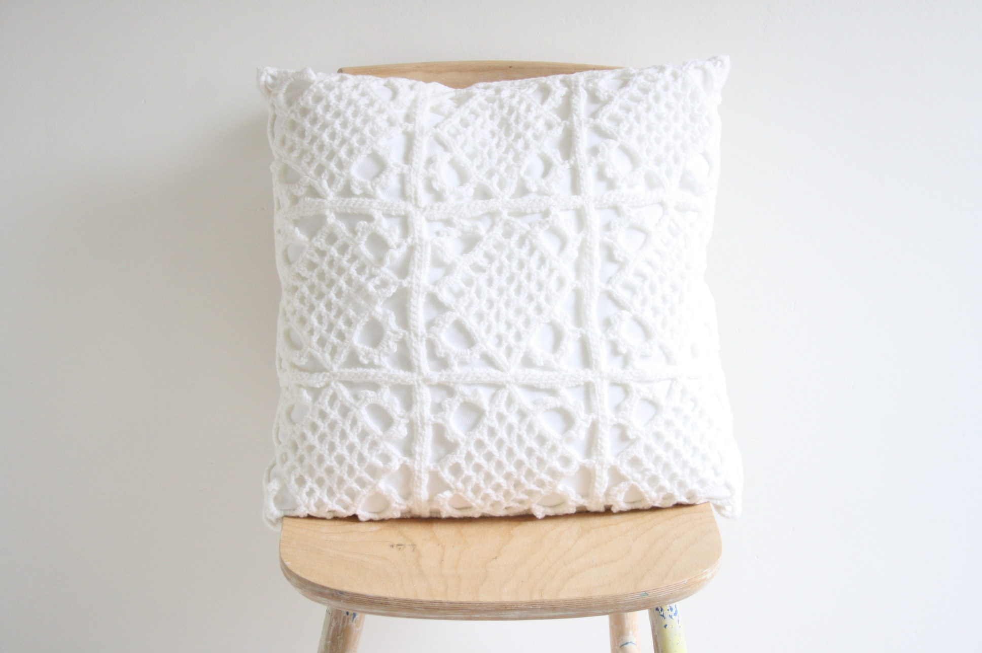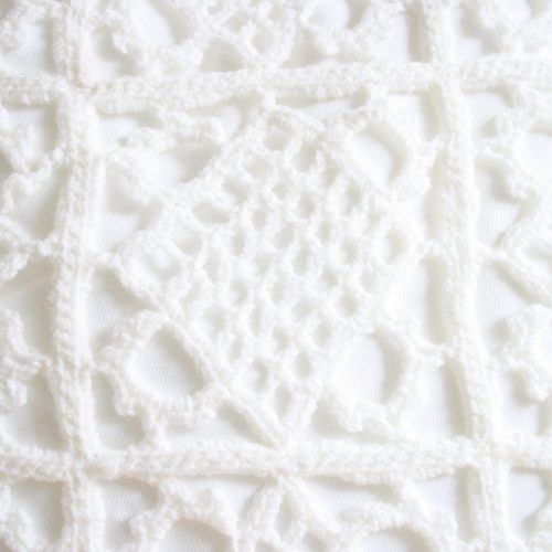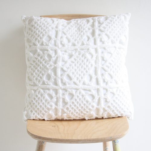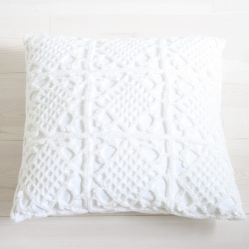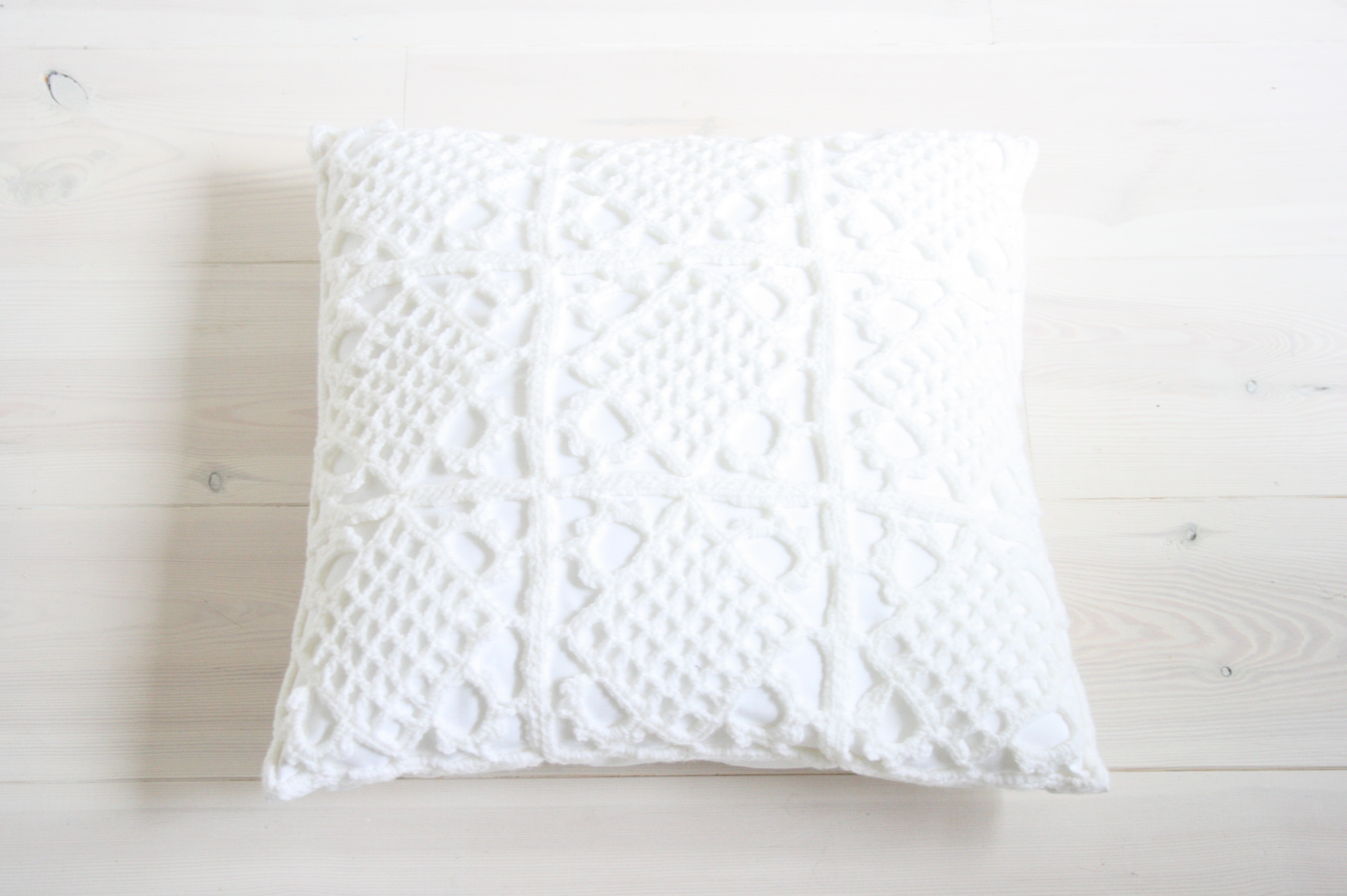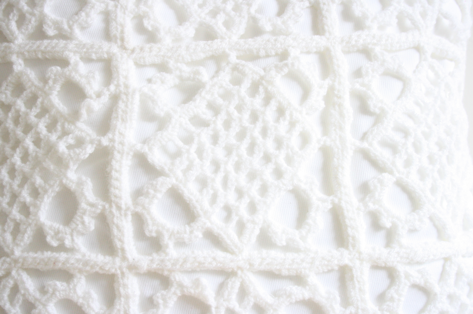 Crochet pillow of white acrylic wool. At the back there is cotton fabric in the same color. The cushion cover has a zipper and can be washed. Size is 45 x 45 cm. Pillow is included.