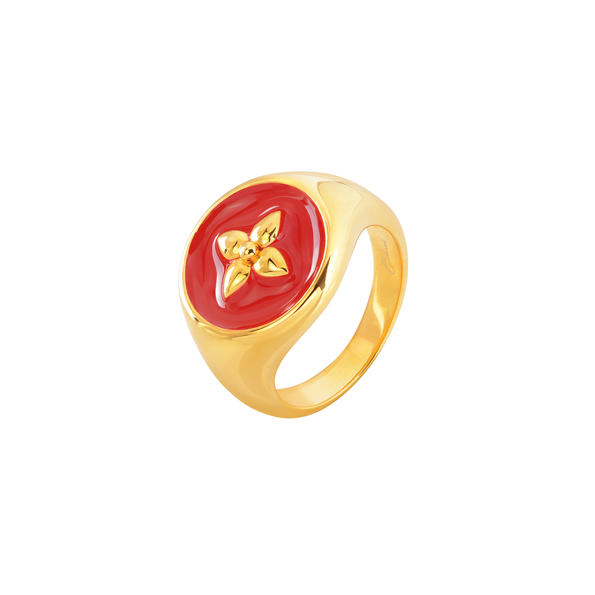 Croisette signet ring in vermeil, 18K gold on 925 silver, purple red lacquer.