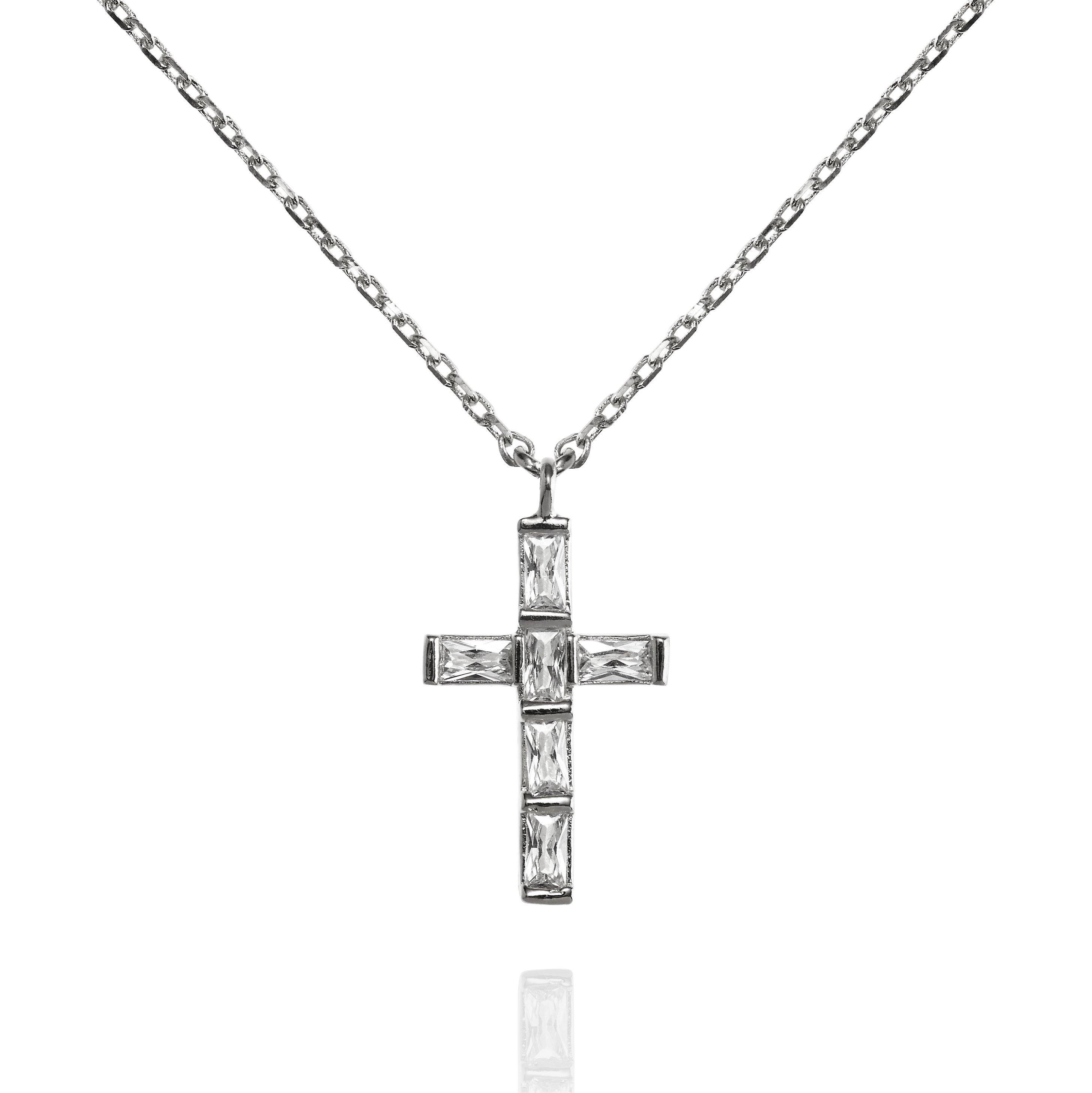 Features Dainty silver cross pendant necklace for women set with cubic zirconia in baguette cut 9mm by 14mm wide pendant necklace with adjustable 18″ chain, including 3-inch extension links Silver pendant necklace made from rhodium plated brass Nickel-free and lead-free high-quality fashion jewellery Presented in a specially designed jewellery box, creating a thoughtful gift for a spiritual friend – or a well-earned treat for you! Description Discreet but elegant, our Namana cross pendant necklace is suitable for women and children. Set with sparkling stones on a dainty chain, this religious symbol is graceful and wearable. Choose from the elegant silver cross or the warm gold colour to suit your style. Presented in its own stylish box to make a thoughtful gift for a best friend or a beautiful treat for you!