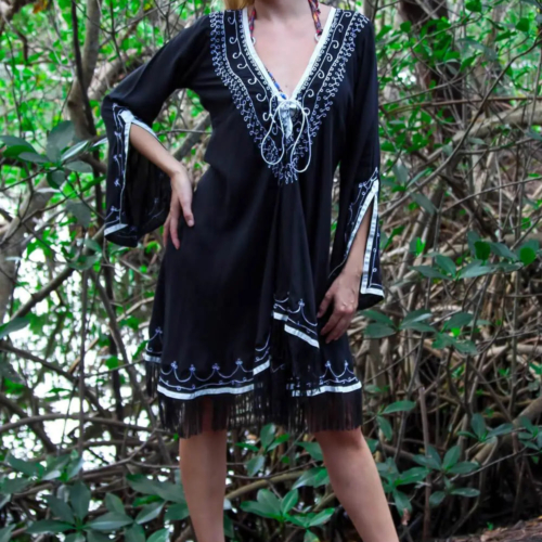 3 S/M , 3 L/XL Casual yet chic, this cover up dress is the perfect mate for your bikini. The throw on and ready to go style makes it comfortable and easy to wear. The ties with embroideryk around the neck, sleeves and hemline add to the allure. This tunic-style v-neck dress is a must have from the house of La Moda. • Tunic Dress, Cover Up, Embroidered • Beachwear, Resort Wear • 100% Rayon • Goga Swimwear • Size: S/M , L/XL• Washing Instruction: Hand Wash with Cold Water, Tumble Dry, Do not Iron