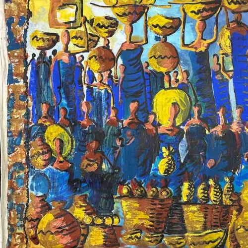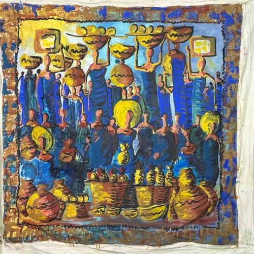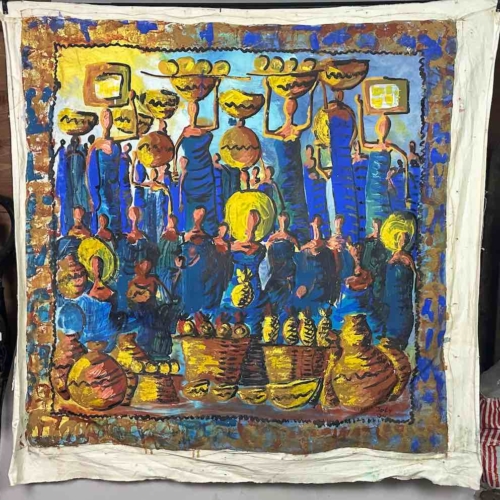 Original artwork, hand painted oil on canvas in Togo, Africa, by a member of a cooperative of artists in Lome, the capital city of Togo.The overall dimensions of the canvas are 53 1/2 x 52″ (136 x 132 cm). The painted area measures 45 3/4 x 46″ (116 x 117 cm).