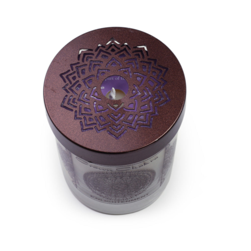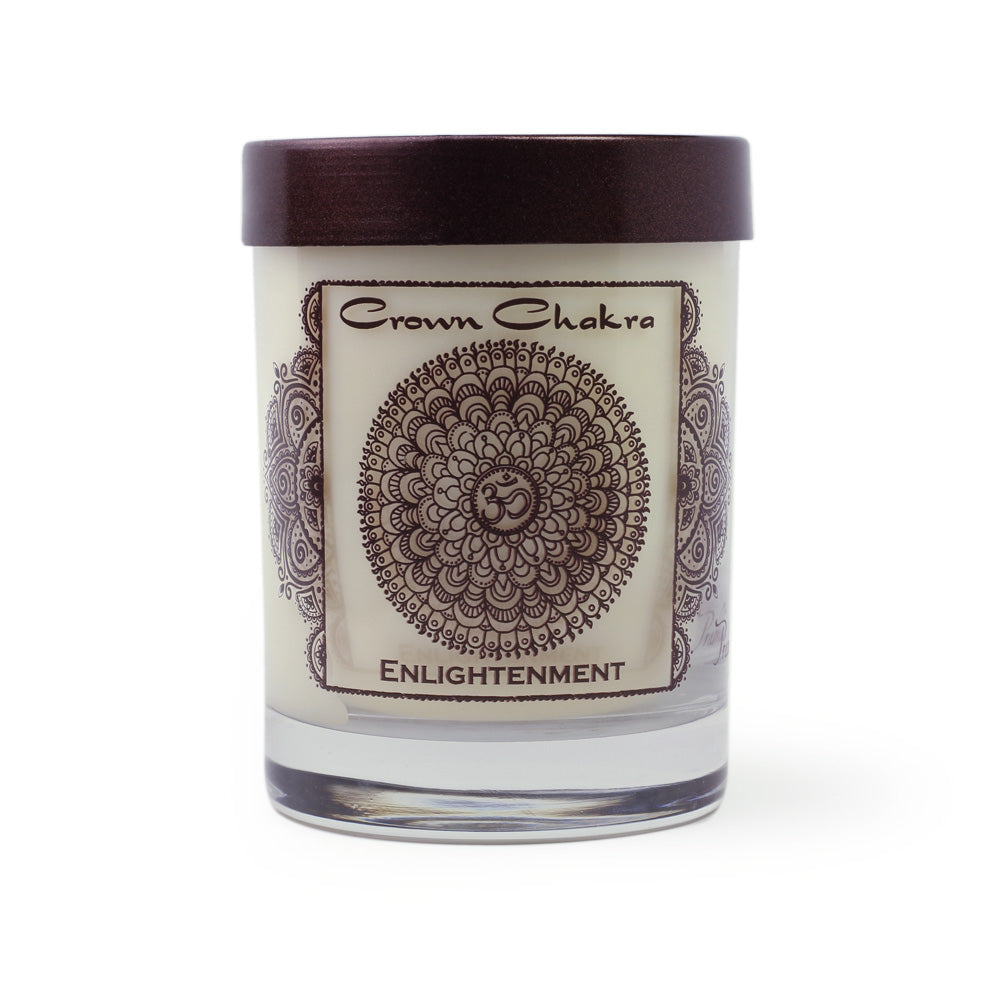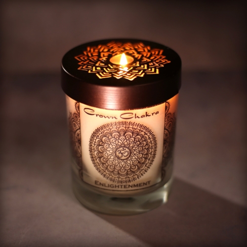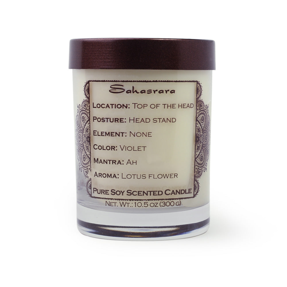 This scented pure soy candle was crafted in accordance with ancient Kundalini wisdom in order to open and stimulate the seven main energetic centers (chakras) located in our astral body. This candle is aesthetically pleasing while fulfilling the intention to attain enlightenment. Aroma: This aromatherapy candle features Lotus flower. Top notes: Neroli Blossom, Wild Strawberry, Sun-Kissed Raspberry. Middle notes: Star Anise, Lotus, Cracked Clove. Dry notes: Patchouli, Rosewood, Musk. Intention: Burn this candle to facilitate the opening of the Sahasrara Chakra, the highest energetic center that, when functioning properly, awakens one’s ability to attain enlightenment. This chakra brings us in touch with consciousness. “When this center is functioning in a balanced way, human beings experience the most elevated level of development in all aspects, plenitude, and a pure and fresh mind. Interest in religion and spiritual topics as well as an attraction to divine consciousness, or the call of God, are closely associated with balance in this center. ” From the book Kundalini… the power is in you by Prabhuji. Key features: This candle’s aroma was chosen based on the wisdom of yogic aromatherapy for chakra stimulation. 100% vegetable-based candles made with premium soy wax for a highly clean and non-toxic burn. Scented with a blend of essential oils, following the International Fragrance Association (IFRA) guidelines. The candle comes with guidance for chakra meditation based on the book “Kundalini… the power is in you” by Prabhuji. Pure cotton wick. Hand-poured in USA. The glass jar stands within ASTM safety standards. An ideal candle for spas, yoga studios, meditation rooms, and altars. Attributes: This unique combination offers exquisite blend of Lotus flower, Patchouli, and Rosewood infused with Star Anise and Cracked Clove. Neroli Blossom and hints of Wild Strawberry combined with Sun-Kissed Raspberry complete this creation to stimulate and awaken the Crown chakra located at the top of the head. Hand-poured in the USA using only high-grade pure soy wax and essential oils, this essential oil candle offers a combination of an elegant design, alluring scent, and pure burning. The lid comes with a design that allows the light to project the carved pattern onto the walls. The geometric pattern of the lid is an ancient yantra, a mystical diagram used in meditation for its occult powers described by Hindu astrology and Tantric texts. Name explanation: The Sahasrara Chakra is one of seven energetic centers in the body. It is the chakra located at the top of the head, closely associated with consciousness. Why customers love it: We crafted these candles inspired in the wisdom of Kundalini yoga in order to help in chakra meditation. Scented with essential oils, these alluring combinations are custom-tailored to balance the chakras. Each of the seven candles has a corresponding yantra (a mystical symbol) carved into the cover, creating an illuminated pattern of sacred geometry that will give a meditative atmosphere to any room. Made of 100% pure soy wax, these soy candles have a highly clean, non-toxic burn. For a complete experience, meditation instructions are included. Collection: Chakra Natural Soy Candles Collection Description: This is one of the seven fragrances in our Chakra Soy Candles Line. Continued use of these specially designed blends helps strengthen the qualities related to each chakra, such as serenity, creativity, self-confidence, sensitivity, wisdom, concentration, and enlightenment. Packaging: The glass jar displays an Indian motif comprised of an elegant mehendi (henna) design. The bottom is made of heavy crystal. The jar is printed with an elegant pattern made with metallic brown organic paint. It portrays the sacred geometry of each chakra and includes the information needed for chakra meditation practice. After the candle has been fully burned, the candle holder can be repurposed as a drinking glass, or whatever creative idea you have in mind. This metal lid was handmade by a team of Fair Trade artisans in India that are committed to promoting the traditional handicrafts. The lids are carved with sacred designs from the Kundalini yoga tradition. Besides creating a pleasing light pattern, the lid reduces carbon build-up in the jar and helps the candle burn evenly. It can also be painted and hung as a decoration for a room or altar. Manufacturing process: This candle was designed based on the Kundalini wisdom presented in Prabhuji’s book. The glass container was selected for its compliance to ASTM safety standards. The candle is hand-poured in USA using pure vegetable soy wax. The oils were tested for their benefits, and the formula was carefully tuned until it reached the perfect balance of hot and cold throw. Two years in the making, the team of designers at Prabhuji’s Gifts worked hard to create these high quality candles aimed at bringing yoga lovers the perfect candle for inducing a meditative experience. Certifications: Gold-level Green America Certified Business Certified Vegan Sustainability: The soy wax used in this candle is environmentally friendly. Candles have no artificial colors. The lid is handmade by artists according to the traditional Indian method, producing minimal waste. This product’s package is made from 100% recyclable paper, and shipping materials are made from recycled and reused packaging products. The jar can be used as a drinking glass after the candle is fully burned. Charitable Cause: Prabhuji’s Gifts supports Prabhuji Mission, a New York-based nonprofit organization that is home to a spiritual community. The mission runs humanitarian projects, including Prabhuji Food Rescue Program, in which the organization feeds people in need in the USA, Dominican Republic, Colombia, and India. By purchasing Prabhuji’s Gifts products, you help support these causes. Ingredients: Pure high grade soy wax, essential oils, cotton wick. How 