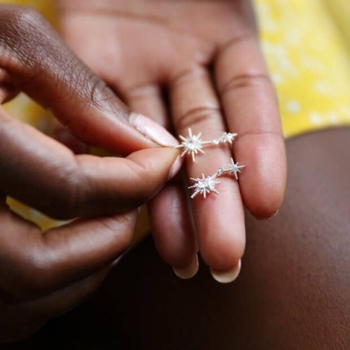 These sterling silver plated brass earrings feature a star stud and a second star charm attached which dangles below, both with crystal detailing in the centre. Complete with hypoallergenic sterling silver posts and butterfly push backs to secure. Dimensionswidth 12mm x height 20mmMade fromsterling silver plated brass, crystals
