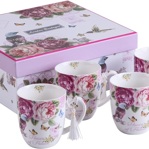 Brand: London BoutiqueColor: Bird Rose ButterflyFeatures: Capacity: 330ml, size: top diameter: 8.5cm, bottom diameter:6cm, high: 10.6cm Suitable for coffee machine, Microwave and Dishwasher safe High quality Fine China porcelain,5 designs–Vintage Retro Rose Pink, Vintage Retro Rose Blue, Bird Rose Butterfly, butterflies Vintage and Contemporary design, Hand Painted in a great detail Ideal gift present—Taylor made gift box, with matching design of the mugs Binding: Kitchen & HomeDetails: Product Description This beautiful bone china mugs come with 5 same mugs in a same designed pattern gift box, perfect for gift present for everyone and any occasions Box Contains 4 mugsPackage Dimensions: 10.5 x 10.2 x 4.5 inches