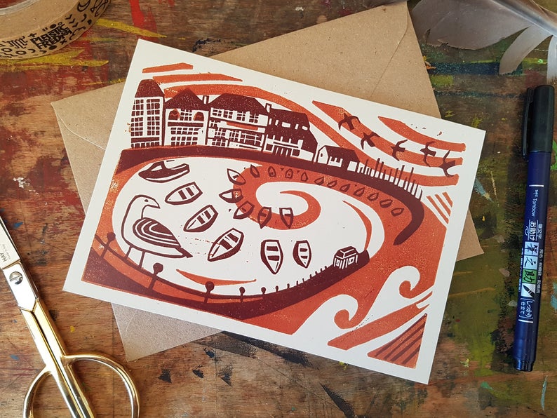 A faithful reproduction of my two-layer linocut print. The original print was inspired by Custom House Quay in Falmouth, home to the Chainlocker and Quayside pubs, looking out over the famous harbour, and alongside Cornwall’s own Trago Mills.