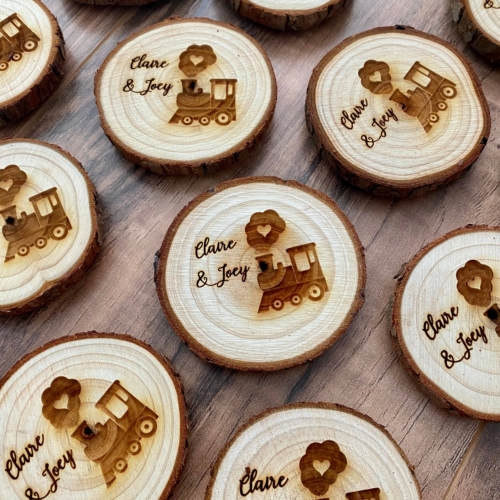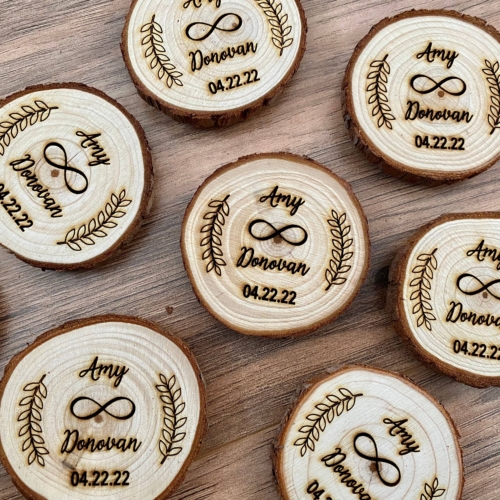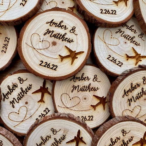 These wood slices are cut from Californian Pine, laser engraved with any custom message or design required, and then have magnets firmly mounted to the back of each.These magnets make great party or wedding favors, save-the-dates, rustic refrigerator magnets, branding/marketing assets, and much more.Each one is roughly 2.5″ in diameter and 1/4″ thick.You may submit a design file, custom text, or request a custom design. Simply send us a message and we’ll create a free mock-up for you.Product photos are examples of custom orders we’ve handled in the past.