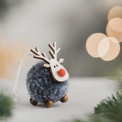 5m x 5cm grey pom pom fabric/wood hanging Elk decoration. the hanging element is approx 9cm. Sold in packs of 6 with a point of sale label to hang them. Availble in cream and red within our range.