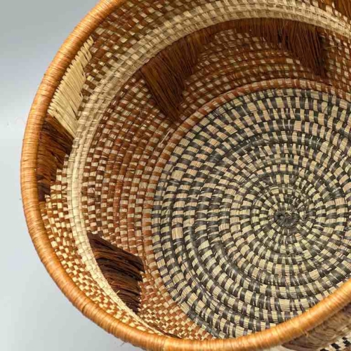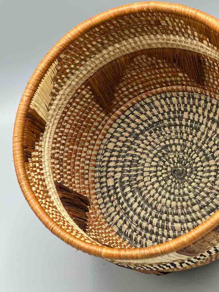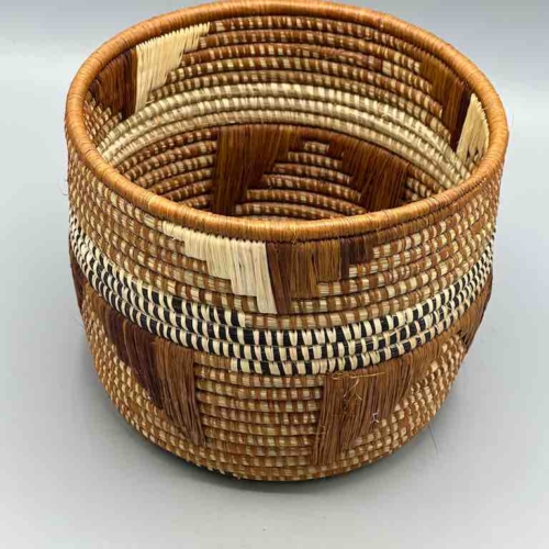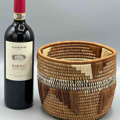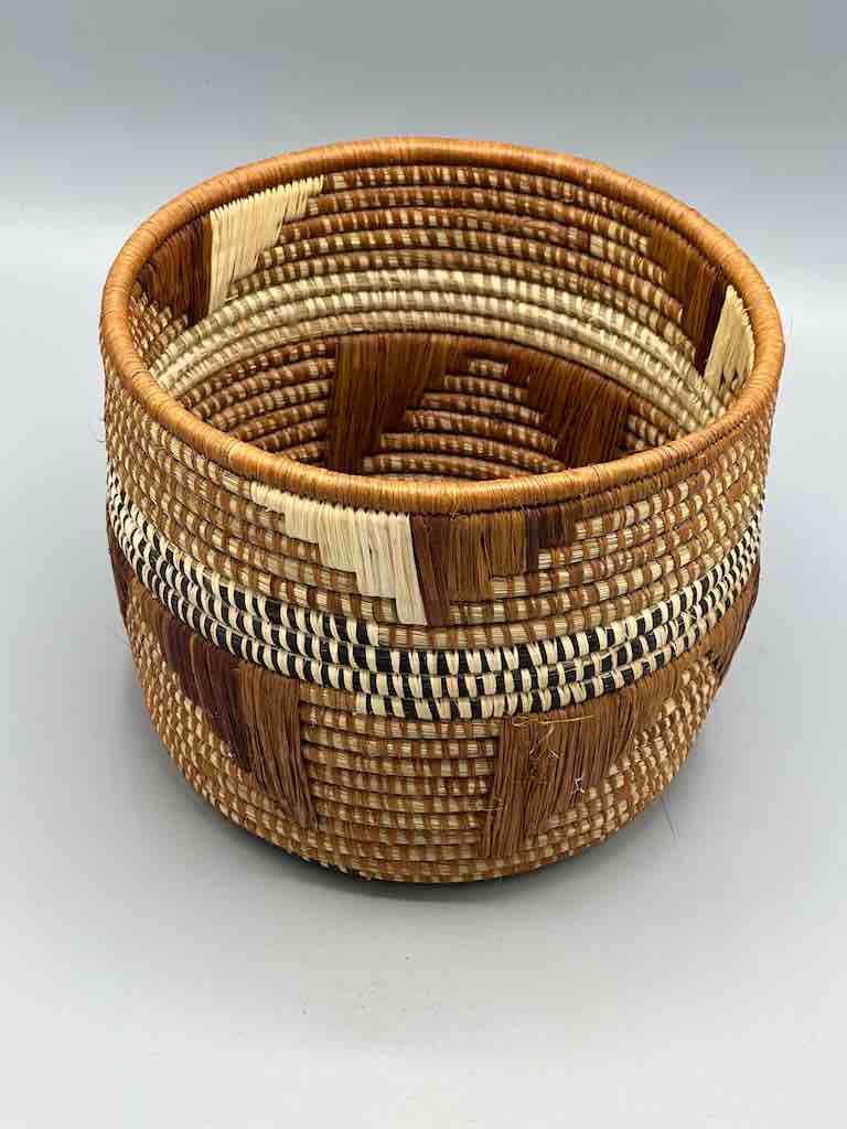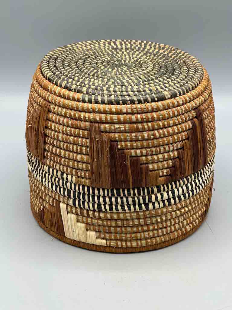 These Batwa baskets are unlike any other African basket. To the coiled grass construction a supplementary raffia woven design is added. The Batwa – the Twa people, a “pygmy” people – live in the border area of southwestern Uganda, northwestern Rwanda and eastern Congo, in the area of the Ruwenzori Mountains, in the Bwindi Impenetrable Forest. They live among a native gorilla population just like we live among whitetail deer. 6 3/8 x 7 7/8” (16 x 20 cm) top diameter.