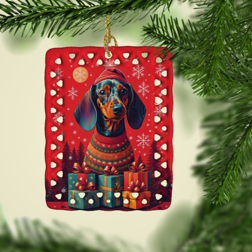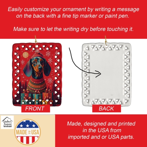 Porcelain Ornament featuring breed specific Dachshund artwork. Celebrate Christmas with this Christmas Ornament. Add a unique, personal touch to your holiday decor with our Rectangular Lattice Porcelain Ornament. Perfect for creating cherished memories, this high-quality ornament shines under festive lights, reflecting warmth and joy throughout your Christmas tree. Crafted with a glossy finish, it showcases vibrant, full-color artwork contributed by our talented artists, ensuring your tree is adorned with a burst of color and holiday spirit. What sets this Porcelain Ornament apart is its customizable white back. Use a paint pen or permanent marker to write a heartfelt message, commemorate a special year, or mark an unforgettable date, turning this ornament into a keepsake that will be treasured for years to come. For best results, allow any personalization to dry thoroughly before handling. Each ornament comes complete with a delicate gold cord, making it easy to hang and display. Proudly made in the USA, this ornament measures 3.375 x 2.625 inches and is a thoughtful gift for pet sitters, teachers, family members, or anyone who would appreciate a little extra holiday magic. Bring style, charm, and a touch of personal meaning to your Christmas tree with this beautifully designed ornament..