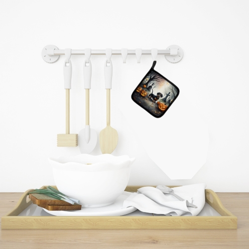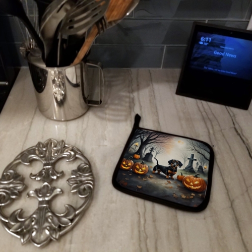 Pair of Pot Holders featuring breed specific Dachshund artwork. Celebrate Halloween with this Halloween Pair of Pot Holders. A Pair of Pot Holders to match your kitchen decor. Made in the USA these are thick and functional. Full color artwork decorates the front polyester fabric of the hot pad and accented by a black trim. Use these at as a trivet for your Thanksgiving or Christmas tablescape. Filled with insulated fabric and quilted for durability. These colorful pot holders will make a great gift for your favorite home cook or executive chef. Each pot holder measures approximately 7 1/2 inches by 7 1/2 inches. A hanging tab is included.