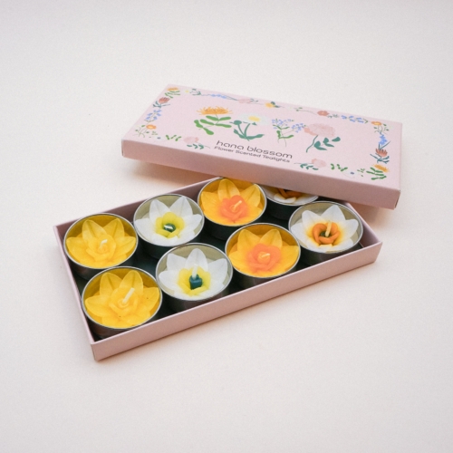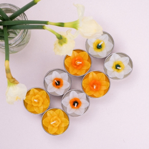 Daffodils are said to symbolise friendship but also the new beginnings. Our 8 assorted Daffodil tealights are handmade and scented with Neroli essential oil, offer a sweet, honeyed, and calming aroma. Come in a beautiful botanical garden packaging, which makes them an ideal gift for any occasion. They are compatible with standard tealight holders. 100% Handmade, vegan, cruelty free and fairly trade