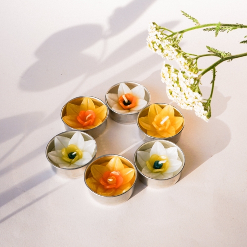 Daffodils are said to symbolise friendship but also the new beginnings. Our 8 assorted Daffodil tealights are handmade and scented with Neroli essential oil, offer a sweet, honeyed, and calming aroma. Come in a beautiful botanical garden packaging, which makes them an ideal gift for any occasion. They are compatible with standard tealight holders. 100% Handmade, vegan, cruelty free and fairly trade
