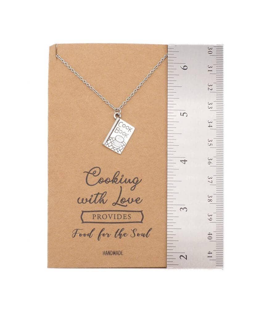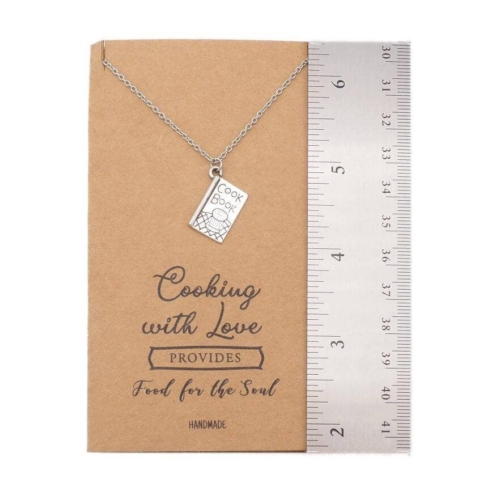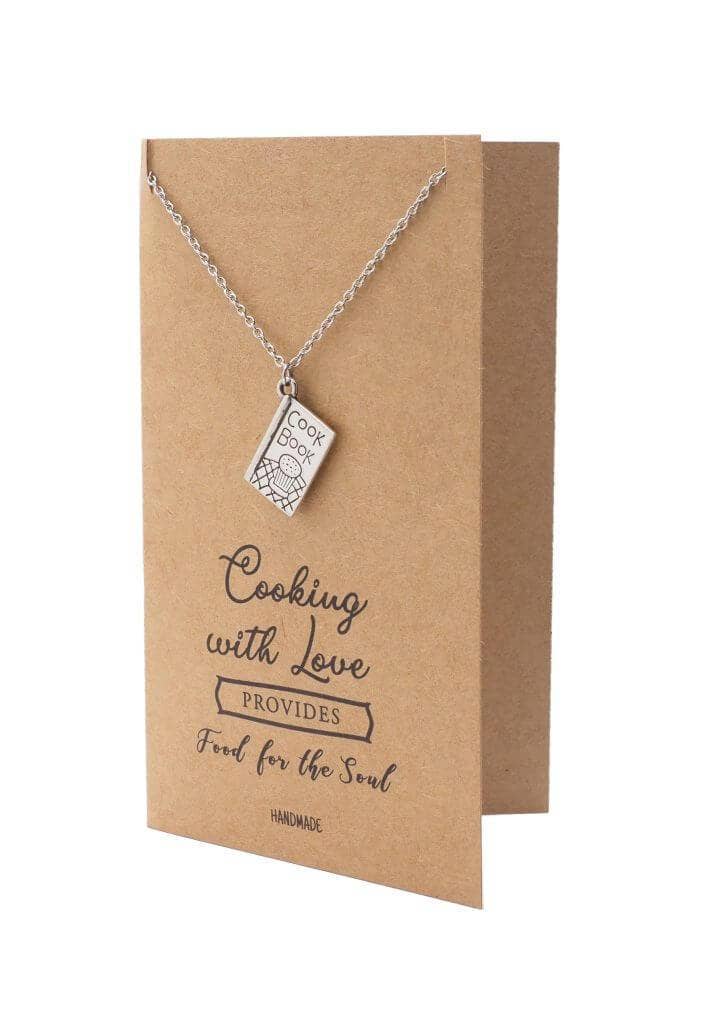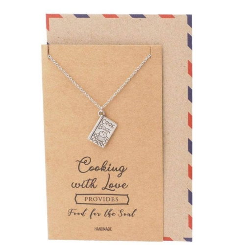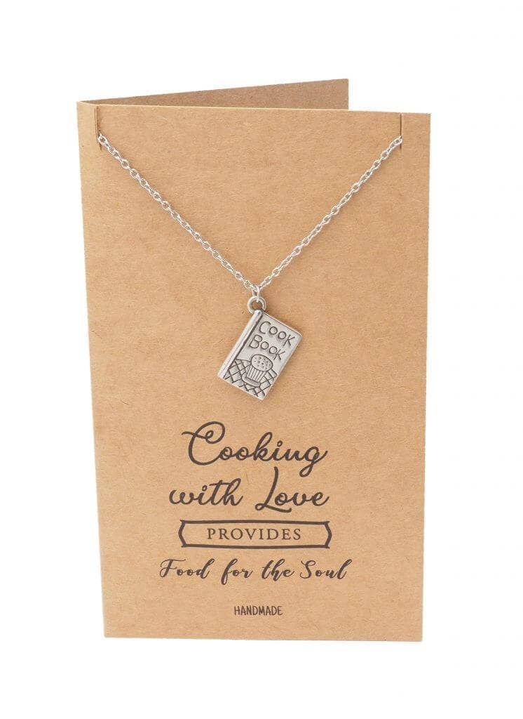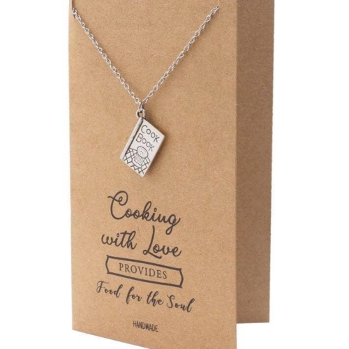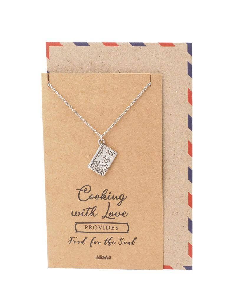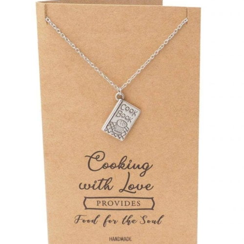 Delight someone (baker, chef, or not) with our Dahlia Cookbook Pendant Necklace with Quote Card, Gifts for Master Chef Cooks & Bakers. This cute kitchen charm necklace is also a great?gift for chefs. One of the best jewelry gifts you can give to friends or loved ones who love cooking and/or baking.
