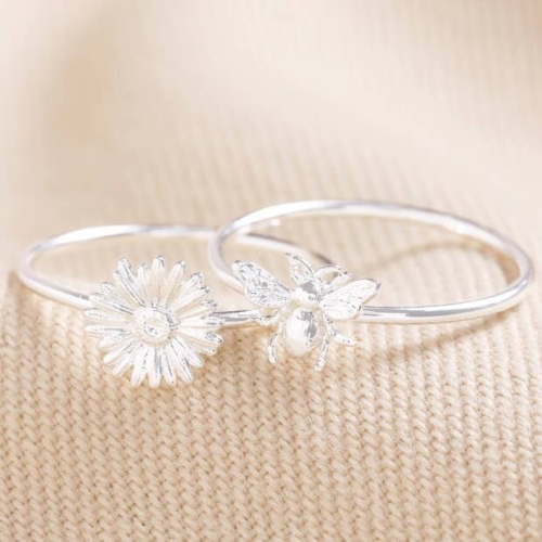 A beautiful set of two silver stacking rings, with one bumblebee ring and one daisy ringFeaturing delicate bands, perfect for layering.Size L/XL Size 15/Q