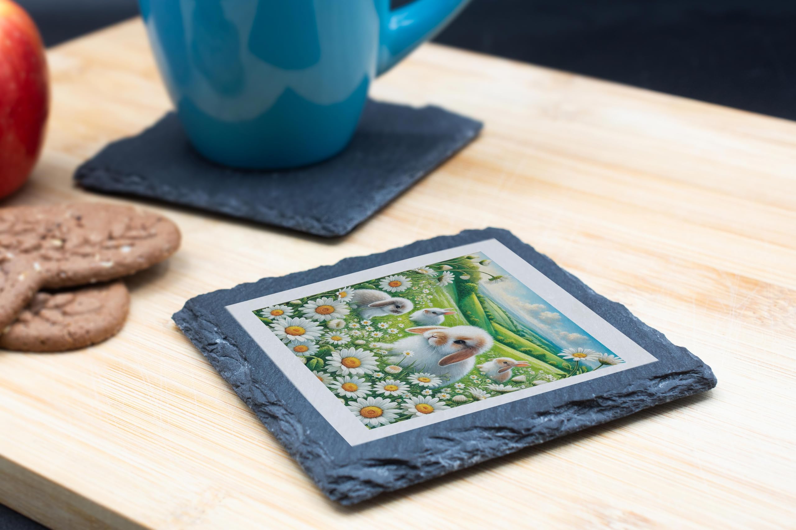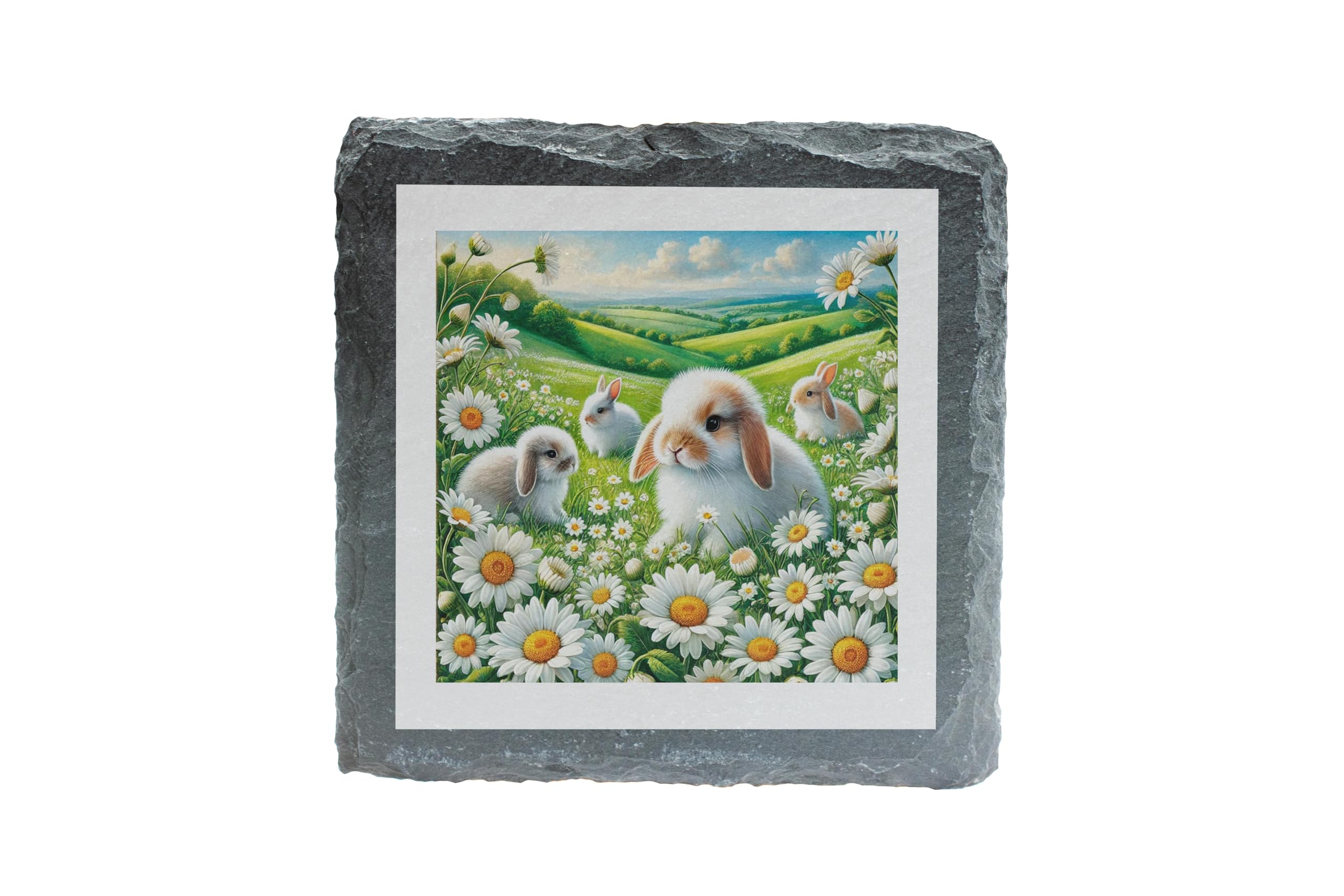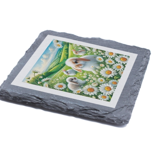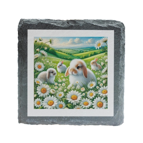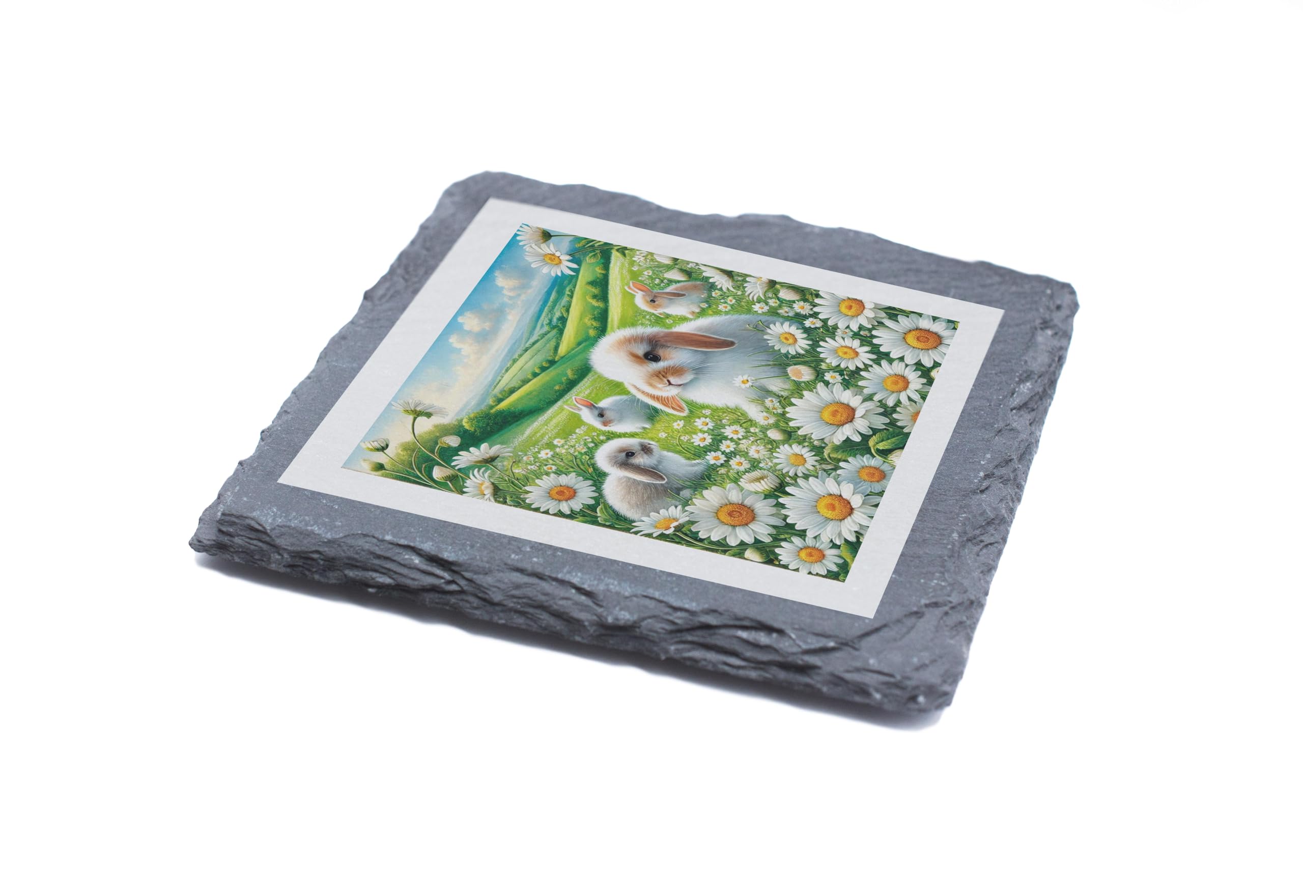 Bring the serene beauty of spring to your home with the Daisy Bunny Slate Coaster. This charming coaster showcases a picturesque scene of fluffy bunnies frolicking among daisies, set against a lush green meadow and a bright blue sky. Perfect for anyone who loves animals or nature-inspired designs. Made from durable slate with a natural rustic finish, this coaster is both functional and decorative. It protects your surfaces from moisture and scratches while adding a touch of whimsy to any table setting. With its non-slip backing, it stays firmly in place, making it a practical yet delightful addition to your home decor. Whether you’re looking for a unique gift for a loved one or a sweet accent piece for your space, this Daisy Bunny Slate Coaster is sure to bring joy and warmth to any setting. Adorable Bunny Design: Features a delightful illustration of fluffy bunnies surrounded by daisies and lush greenery. Natural Slate Material: Crafted from high-quality slate with a rustic finish for a timeless appeal. Perfect Gift: An ideal present for animal lovers, nature enthusiasts, or those who appreciate whimsical designs. Practical and Decorative: Protects surfaces from spills while adding a charming accent to your home. Non-Slip Padding: Equipped with non-slip pads for added stability and surface protection.