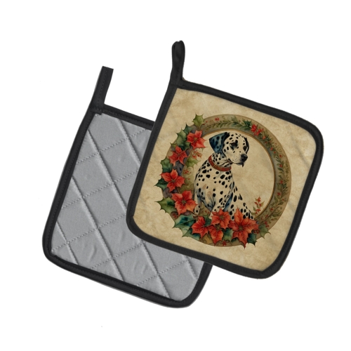 Pair of Pot Holders featuring breed specific Dalmatian artwork. Celebrate Christmas with this Christmas Pair of Pot Holders. A Pair of Pot Holders to match your kitchen decor. Made in the USA these are thick and functional. Full color artwork decorates the front polyester fabric of the hot pad and accented by a black trim. Use these at as a trivet for your Thanksgiving or Christmas tablescape. Filled with insulated fabric and quilted for durability. These colorful pot holders will make a great gift for your favorite home cook or executive chef. Each pot holder measures approximately 7 1/2 inches by 7 1/2 inches. A hanging tab is included.