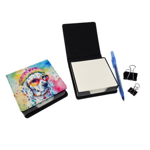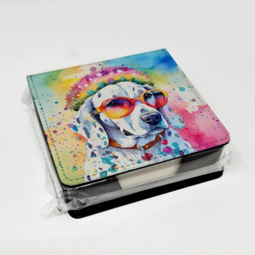 PU Leather Note Paper Holder featuring breed specific Dalmatian artwork. Elevate your workspace with this PU Leather Note Paper Holder, crafted to resemble luxurious leather without the use of animal products. Made from durable synthetic PU leather, it offers both a premium look and eco-friendly appeal. This note holder, compactly sized at 4.25 x 4.25 x 1.25 inches, includes about 160 sheets of 3.75 x 3.75-inch note paper—ideal for quick notes and reminders. An exclusive artist-designed cover makes each holder uniquely vibrant, adding a splash of color and personality to any desk or office. The discrete design keeps note paper hidden, maintaining a neat and organized workspace. Perfect as a gift or for personal use, this stylish holder is refillable with standard paper, ensuring long-lasting utility. A must-have for anyone seeking a sophisticated, artful touch to their workspace while supporting animal-friendly products. Add style, organization, and creativity to your everyday routine with this elegant note paper holder.