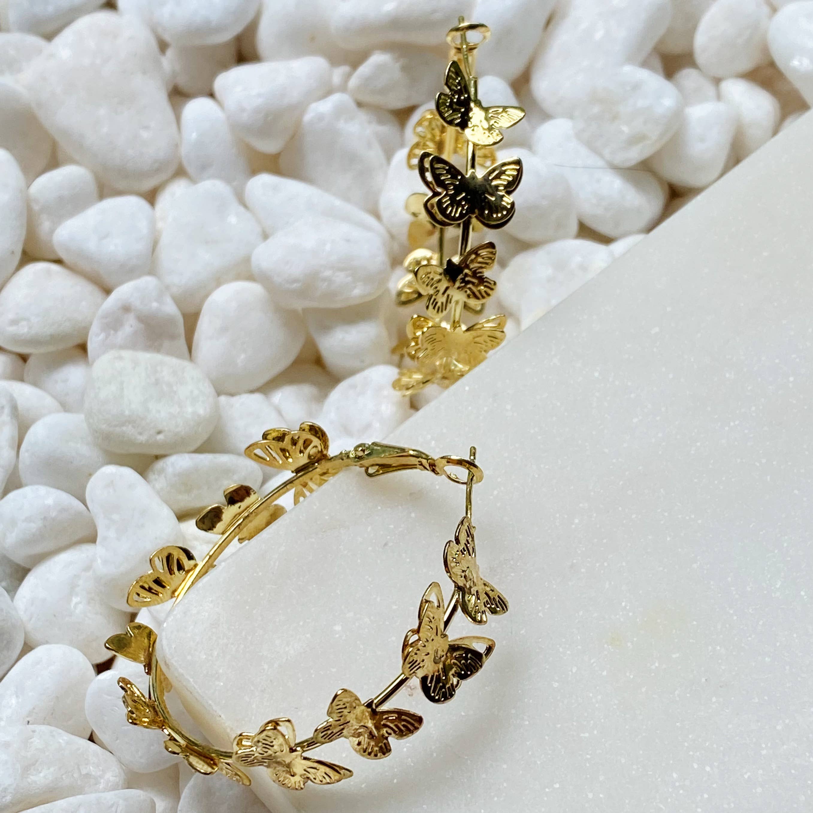 Absolutely gorgeous butterfly all around hoop earrings. Doubled butterflies and single butterflies make perfect harmony in this pair. Watch out, they might fly away. 1.5 inch diameter that is nice size for everyday wear. 1.5 x 0.3 inch for dimension. Alloy metal Lead and Nickel compliant Made in China
