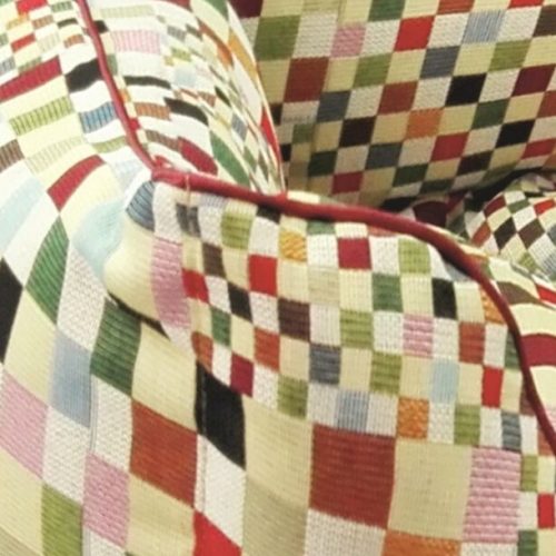 Solid, particularly high-quality and robust furniture design cover with woven check pattern and dark red satin piping.
