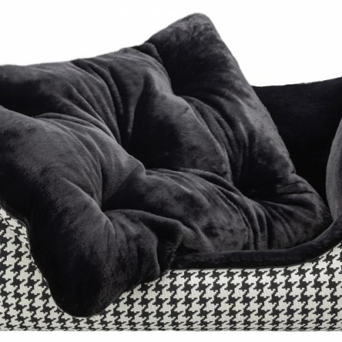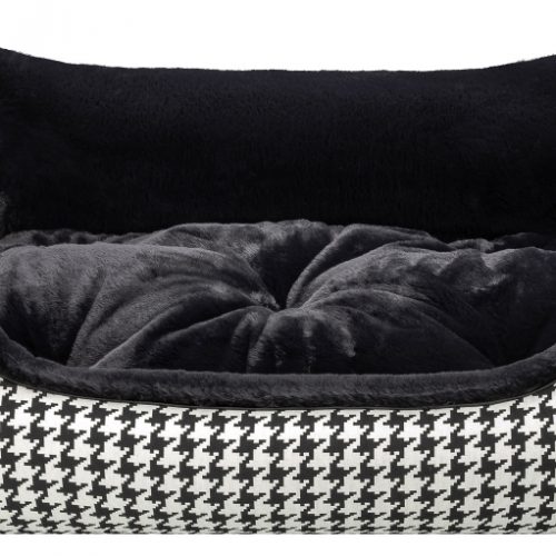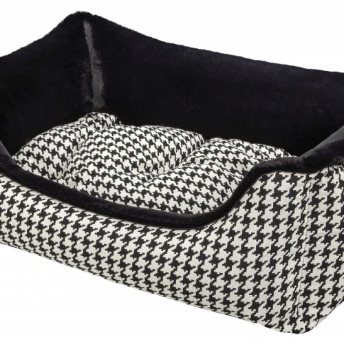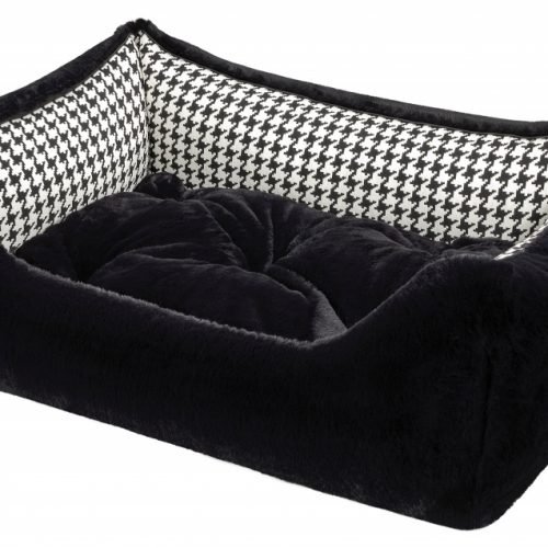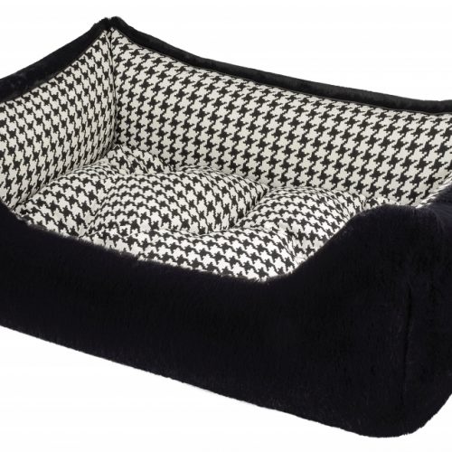 The cover consists of a designer fabric with a woven black and white houndstooth pattern, decorated with a black satin piping. The robust fabric is wonderfully smooth, hair-repellent and is Ökotex Standard 100 certified. The other side is made of a quality high-end woven fur with incomparable super soft fur and silky shine. The side parts and the inside cushion can be turned over so that the fur or fabric side is either inside or outside, depending on your wishes. The luxurious look of this dog bed makes it something very special and at the same time gives your dog an incredibly cuddly sleeping experience.