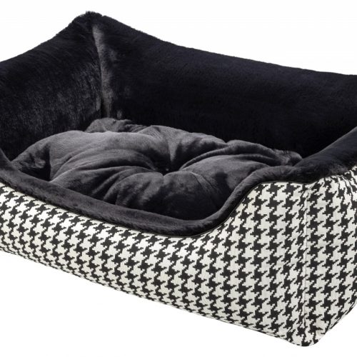 The cover consists of a designer fabric with a woven black and white houndstooth pattern, decorated with a black satin piping. The robust fabric is wonderfully smooth, hair-repellent and is Ökotex Standard 100 certified. The other side is made of a quality high-end woven fur with incomparable super soft fur and silky shine. The side parts and the inside cushion can be turned over so that the fur or fabric side is either inside or outside, depending on your wishes. The luxurious look of this dog bed makes it something very special and at the same time gives your dog an incredibly cuddly sleeping experience.