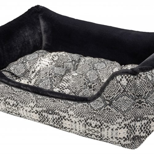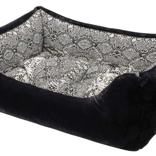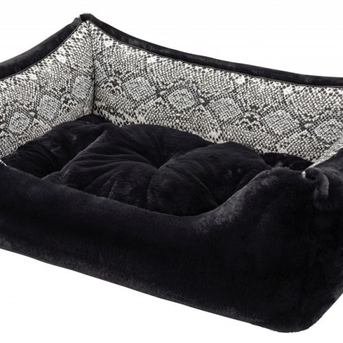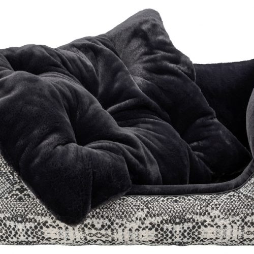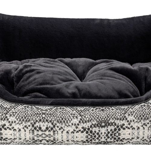 The cover consists of a designer fabric with a woven black and white houndstooth pattern, decorated with a black satin piping. The robust fabric is wonderfully smooth, hair-repellent and is Ökotex Standard 100 certified. The other side is made of a quality high-end woven fur with incomparable super soft fur and silky shine. The side parts and the inside cushion can be turned over so that the fur or fabric side is either inside or outside, depending on your wishes. The luxurious look of this dog bed makes it something very special and at the same time gives your dog an incredibly cuddly sleeping experience.