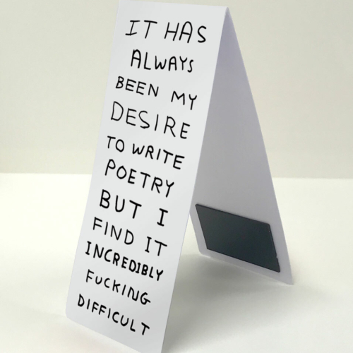 Adorned with David Shrigley’s quirky illustrations and witty humour, this funny magnetic bookmark is perfect for people who love to read books but don’t like creasing the pages! These clever little magnetic bookmarks fold neatly over one or several pages and clip together magnetically – so unlike a traditional bookmark, will not fall out! Don’t settle for boring old bookmarks when you can add a touch of Shrigley’s brilliance to your offerings!Printed in the UK on high quality material, it’s as sturdy as it is humorous. The design is printed on both sides.Dimensions: 45mm x 105mm (when folded)Weight: 11g