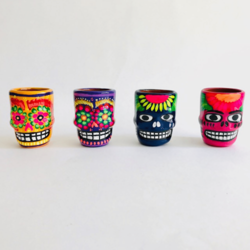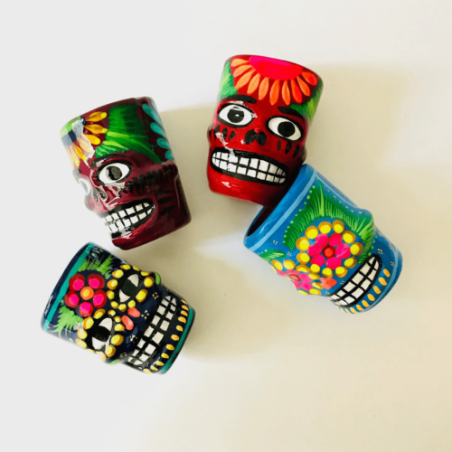 Whimsical and colorful. These are painted skull mezcalero shot glasses in the Day of the Dead style. Handmade and painted by artisans in rural Guerrero. Great for celebrating your favorite holiday and enjoying mezcal with your friends.