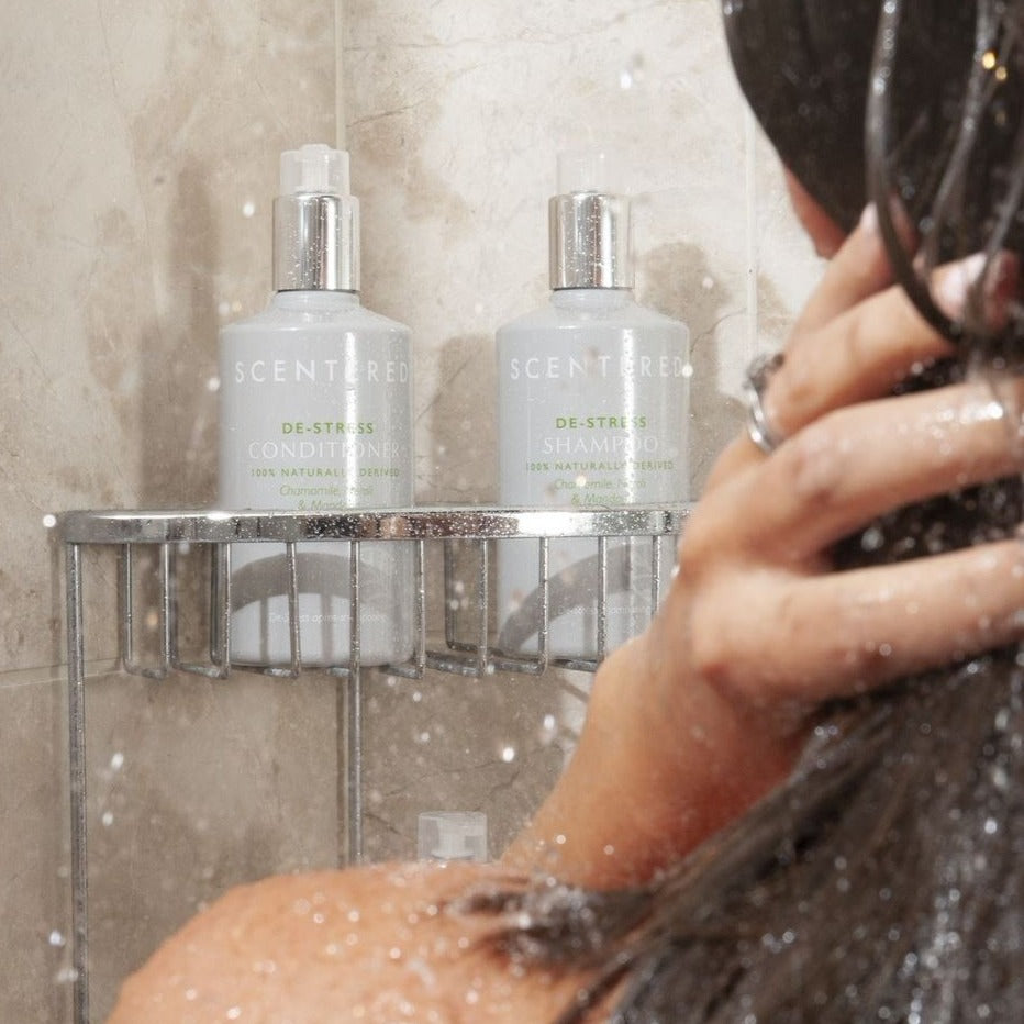 Elevate your routine with our De-stress Conditioner, blended with 100% naturally derived ingredients and designed to help boost shine and support healthy hair whilst giving a calming experience that helps you unwind and de-stress. Suitable for all hair types this restorative conditioner will nourish and protect your hair and scalp, leaving you relaxed and your hair feeling healthy and hydrated. Start your routine with our DE STRESS Shampoo