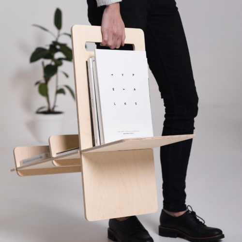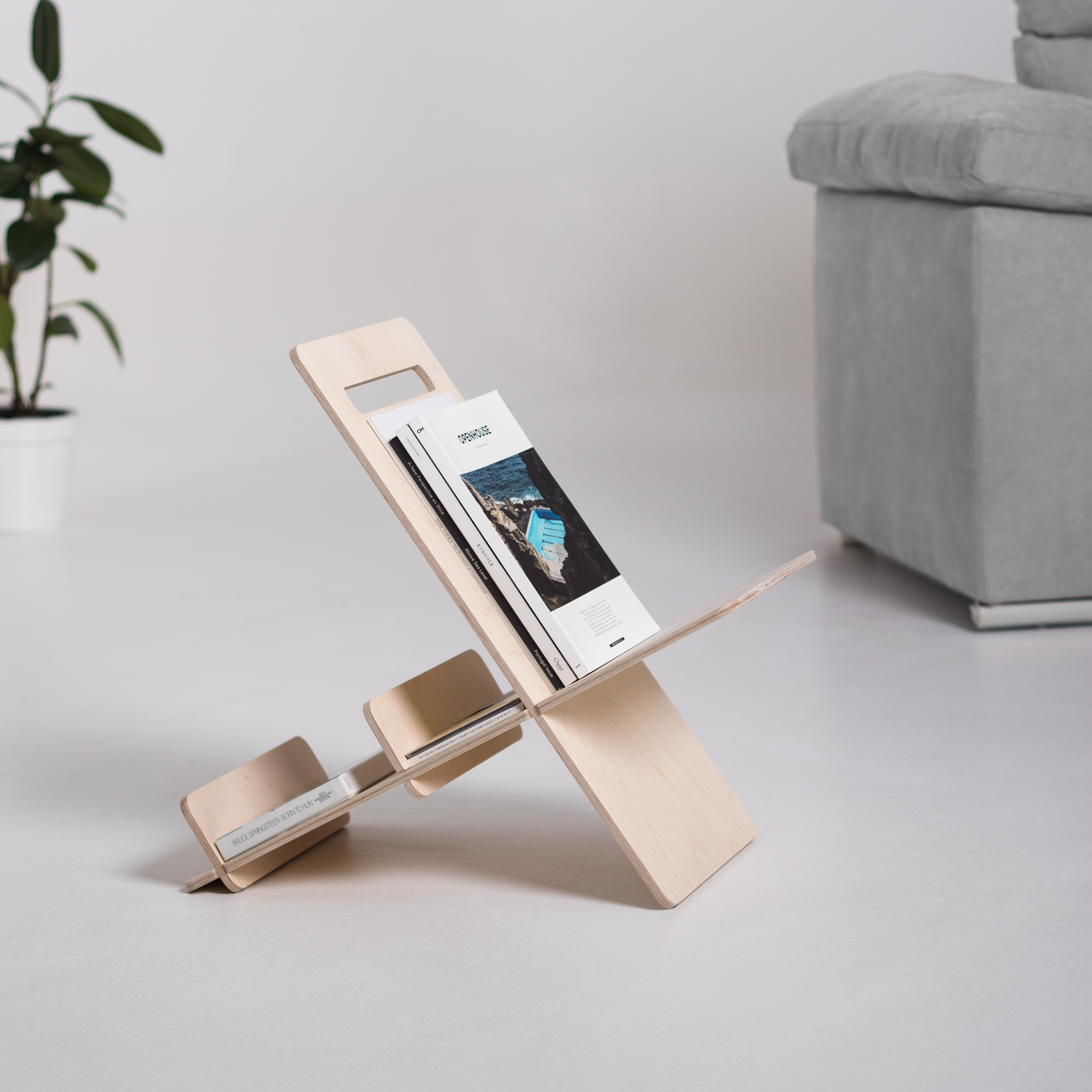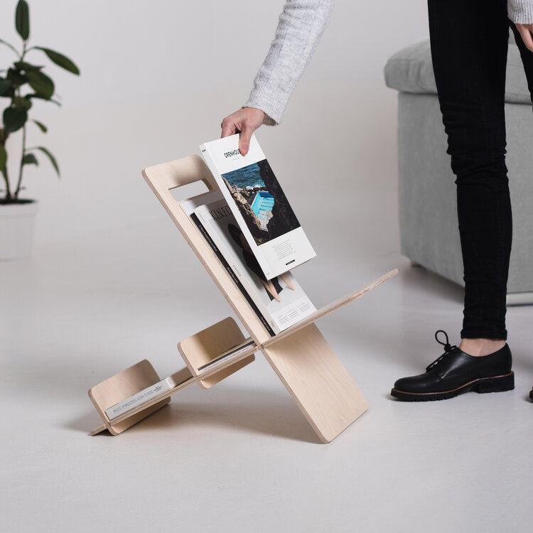 The DEBOOK is a minimalist magazine rack made of birch wood. It has spots created specifically to keep books, magazines or vinyls, CDs, and DVDs, and it is built in four pieces that fit together so that you do not need any extra tools to ensemble it. It can also be moved around easily thanks to its handle, which can be used to keep your books or magazines open by the last page you read as well.