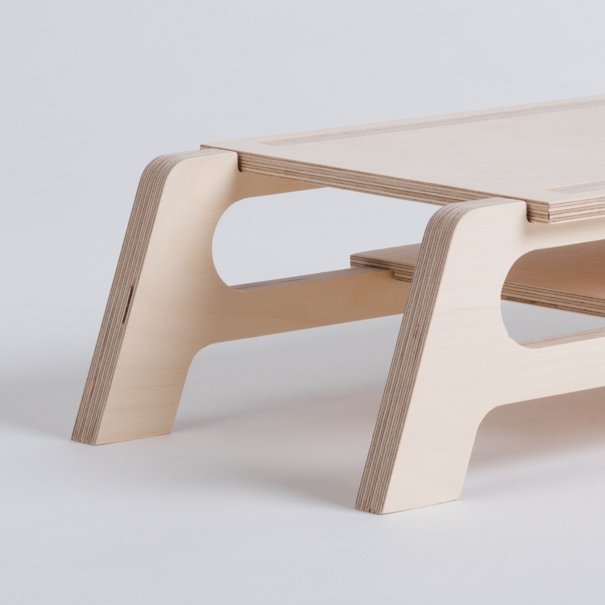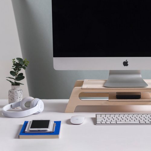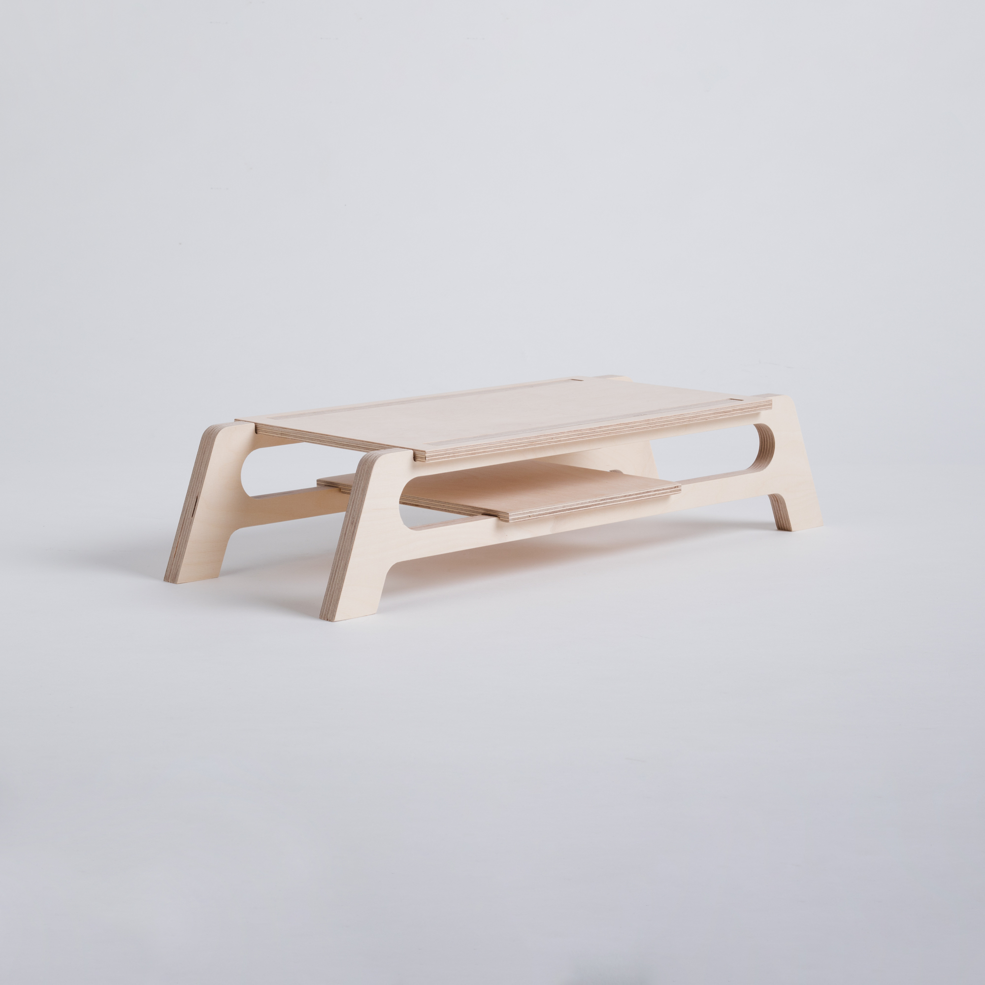 The DEBRIDGE is a stand for your desktop computer, with a minimalist design and made of birch wood. The DEBRIDGE raises the screen 11.5 cm (4.5 in), which reduces the tension that builds up on your neck after working for a few hours. Besides, there are three areas in the DEBRIDGE that will allow you to keep your desk organized and still have enough space to work comfortably: hide your keyboard in the space under the stand, keep your hard drive, the mouse or your planner on the small mobile tray that you’ll find in the middle of the stand, and leave your office supplies on top of the stand, next to the screen.