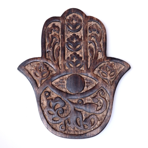 Hamsa ; Hand of Fatima ;Hand of Mary This hand-shaped amulet of Middle-East and North-African ancient origin, is common for Muslims, Jews and Christians. This emblem depicting the open right hand, symbolizing blessing, prosperity, and protection against evil eye. Our line of wooden Hamsa decor, is made to be hung on a door or a wall. An ornamental piece, designed with meaningful motifs, and carefully carved in Mango wood, with complementary light burn finish, by skillful artisans. The Decor piece has hanging arrangement on the back on top and bottom, to be hung either way as desired. Charitable Cause: Prabhuji’s Gifts supports Prabhuji Mission, a New York-based, nonprofit religious organization that is home to a spiritual community. Prabhuji mission runs humanitarian projects including the Prabhuji Food Rescue and Prabhuji Food Distribution Programs, in which the organization feeds people in need in the USA, and the Prabhuji Toy Distribution program, helping provide Christmas gifts to children of unprivileged families. By purchasing Prabhuji’s Gifts products, you help support these causes. Specs SKU: 510-03 UPC: 8-09581-51003-4HXWXD: 7”x6”x0.75” Weight: 0.36 lb Made in India Return Policy: This product is fully refundable.
