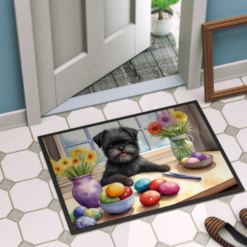 Doormat featuring breed specific Affenpinscher artwork. Celebrate Easter with this Easter Doormat. Welcome your guests in style with our Artwork Door Mat, designed to withstand almost any weather condition. This mat, measuring approximately 24 by 36 inches, is held together by durable black binding tape. Its top layer, composed of polyester felt, is dyed with the eye-catching image you see on the mat. A few layers below provide the mat with stability, while its rubber bottom is stamped to help prevent slipping and ensures safety. Our mat works wonderfully as both an indoor or outdoor door mat. For cleaning, simply hose it off with water or use a power washer – no need for any cleaner that produces suds. Avoid scrubbing with a brush, instead, opt for the vacuum on floor setting. Designed manufactured and printed in the USA, this mat is a perfect addition to your porch, outdoor kitchen, entryway, or any indoor space. Its unique design makes it a charming decorative rug that greets your guests and adds a stylish touch to your home decor.