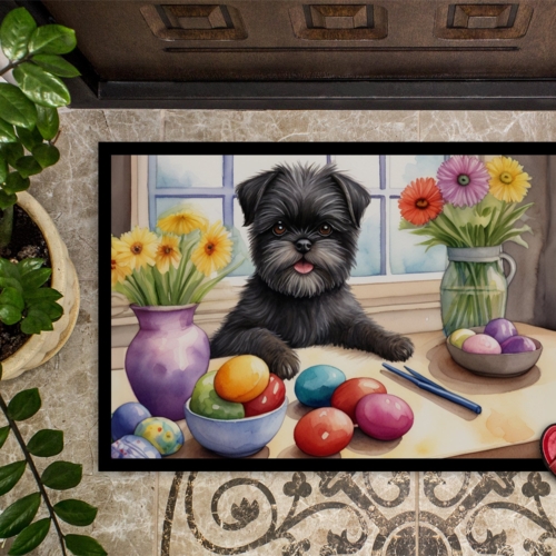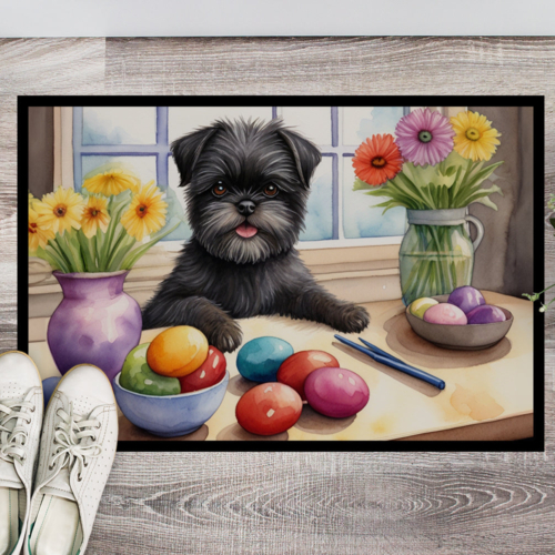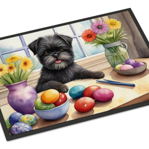 Doormat featuring breed specific Affenpinscher artwork. Celebrate Easter with this Easter Doormat. Welcome your guests in style with our Artwork Door Mat, designed to withstand almost any weather condition. This mat, measuring approximately 18 by 27 inches, is held together by durable black binding tape. Its top layer, composed of polyester felt, is dyed with the eye-catching image you see on the mat. A few layers below provide the mat with stability, while its rubber bottom is stamped to help prevent slipping and ensures safety. Our mat works wonderfully as both an indoor or outdoor door mat. For cleaning, simply hose it off with water or use a power washer – no need for any cleaner that produces suds. Avoid scrubbing with a brush, instead, opt for the vacuum on floor setting. Designed manufactured and printed in the USA, this mat is a perfect addition to your porch, outdoor kitchen, entryway, or any indoor space. Its unique design makes it a charming decorative rug that greets your guests and adds a stylish touch to your home decor.
