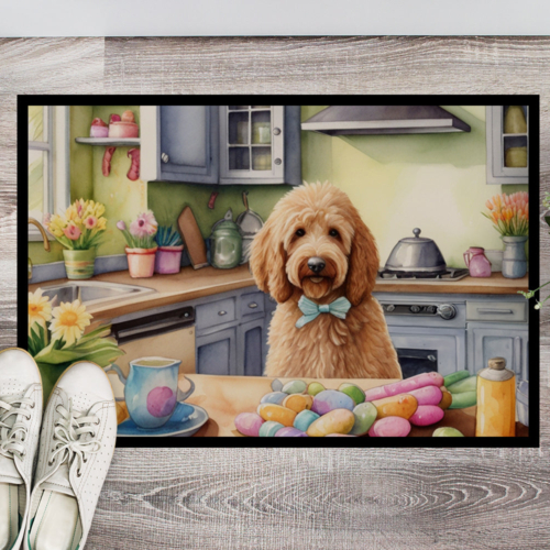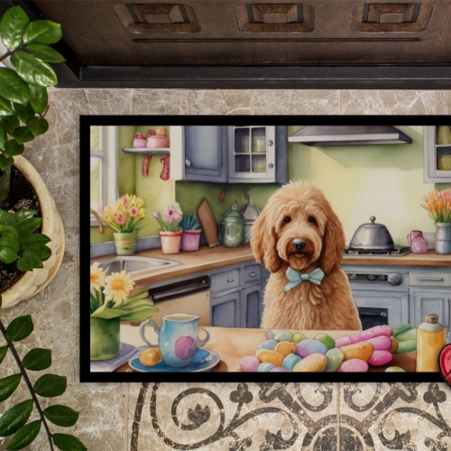Doormat featuring breed specific Goldendoodle artwork. Celebrate Easter with this Easter Doormat. Welcome your guests in style with our Artwork Door Mat, designed to withstand almost any weather condition. This mat, measuring approximately 18 by 27 inches, is held together by durable black binding tape. Its top layer, composed of polyester felt, is dyed with the eye-catching image you see on the mat. A few layers below provide the mat with stability, while its rubber bottom is stamped to help prevent slipping and ensures safety. Our mat works wonderfully as both an indoor or outdoor door mat. For cleaning, simply hose it off with water or use a power washer – no need for any cleaner that produces suds. Avoid scrubbing with a brush, instead, opt for the vacuum on floor setting. Designed manufactured and printed in the USA, this mat is a perfect addition to your porch, outdoor kitchen, entryway, or any indoor space. Its unique design makes it a charming decorative rug that greets your guests and adds a stylish touch to your home decor.