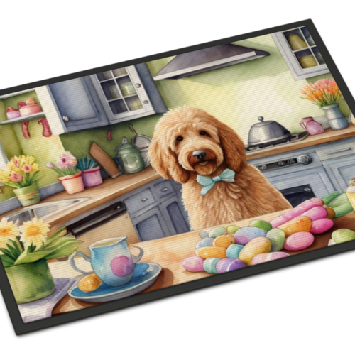 Doormat featuring breed specific Goldendoodle artwork. Celebrate Easter with this Easter Doormat. Welcome your guests in style with our Artwork Door Mat, designed to withstand almost any weather condition. This mat, measuring approximately 18 by 27 inches, is held together by durable black binding tape. Its top layer, composed of polyester felt, is dyed with the eye-catching image you see on the mat. A few layers below provide the mat with stability, while its rubber bottom is stamped to help prevent slipping and ensures safety. Our mat works wonderfully as both an indoor or outdoor door mat. For cleaning, simply hose it off with water or use a power washer – no need for any cleaner that produces suds. Avoid scrubbing with a brush, instead, opt for the vacuum on floor setting. Designed manufactured and printed in the USA, this mat is a perfect addition to your porch, outdoor kitchen, entryway, or any indoor space. Its unique design makes it a charming decorative rug that greets your guests and adds a stylish touch to your home decor.