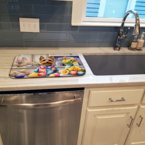 Dish Drying Mat featuring breed specific Silky Terrier artwork. Celebrate Easter with this Easter Dish Drying Mat. Say goodbye to messy countertops and soggy dish towels with our innovative dish drying mat. Our high-quality dish drying pad is designed to keep your countertops dry while offering a stylish and efficient solution. Whether you’re air drying dishes, glasses, stemware, silverware, pots, pans, bottles, or even fruits and vegetables, our dish mat is the perfect choice. The 14 inches x 22 inches size fits most counters and dish drying racks, and the non-slip design ensures stability. Made with water-absorbent polyester and a polyurethane foam insert, our dish drying mat is not only functional but also durable. It’s machine washable and printed in the USA for long-lasting use. The beautiful artwork adds flair to your kitchen decor, making it a perfect housewarming gift or present for any occasion. Upgrade your kitchen experience with our absorbent and versatile dish drying mat.